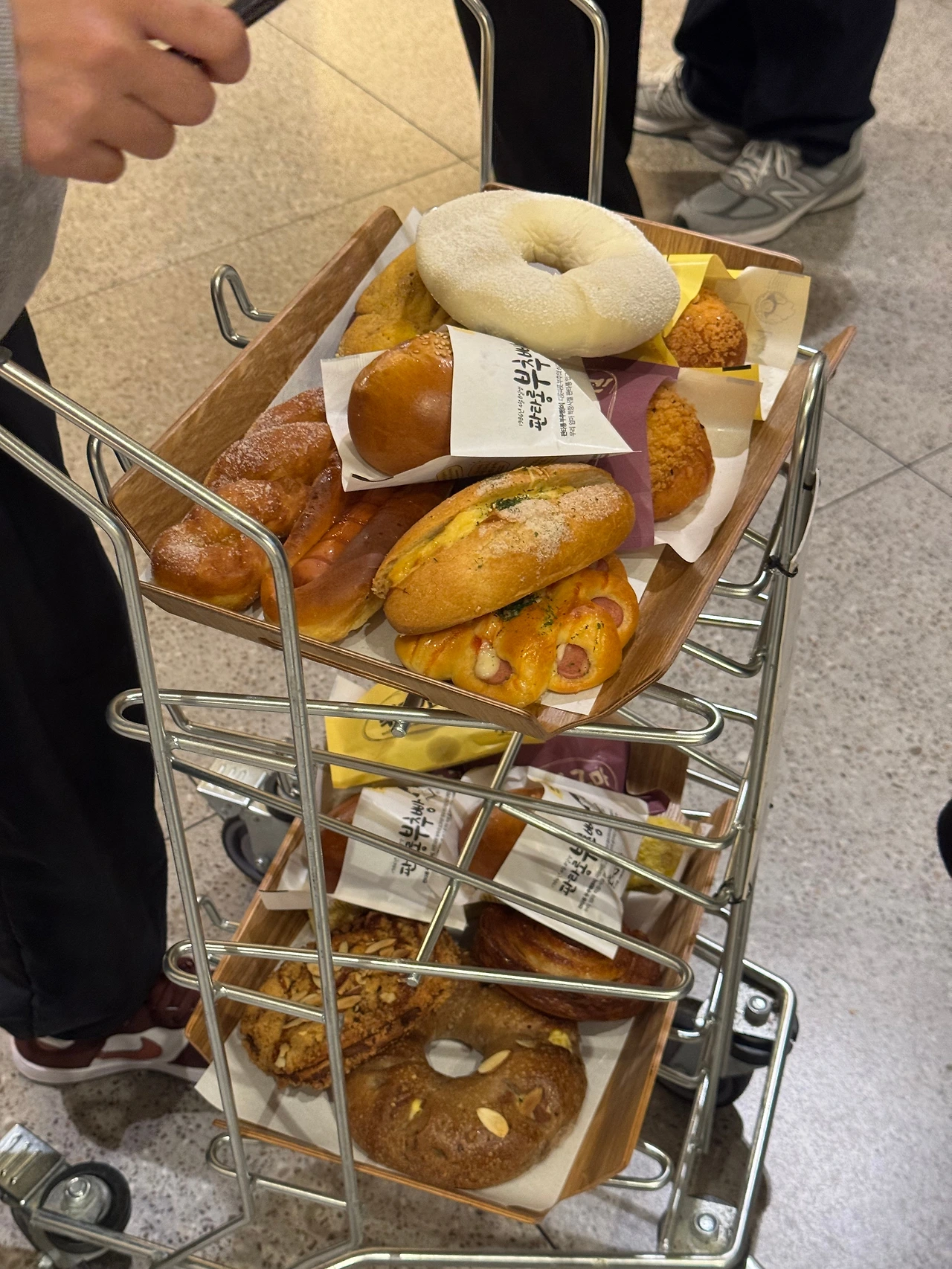 기다림 끝에 성심당에 들어갔을 때 수많은 빵을 들고 다니기에는 불편하기에 빵을 편하게 마음껏 고를 수 있게 그리고 이동도 편하게 해주는 빵 카트까지 제공합니다(제가 직접 담은 빵입니다).