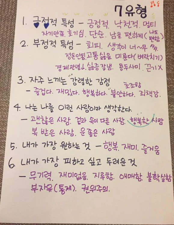 유형들을 개괄적으로 훑어보면서 내 유형인 것 같은 쪽으로 선택해서 움직였다. 그리고 각 유형끼리 1) 나의 긍정적 특성, 2) 부정적 특성, 3) 내가 자주 강렬하게 느끼는 감정, 4) 나는 나를 어떤 사람이라 생각하는가, 5) 내가 가장 원하는 것, 6) 내가 가장 피하고 싶고 두려운 것에 대해 토의했다. 그리고 2절지에 정리했다. 다른 유형들은 1번 고민하고 있을 때 우리 모둠은 6번 쓰고 있었다.(시작하자마자 펜잡고 그냥 쓰지 뭐! 하고 시작해서 후딱 끝내고 진짜 완벽하다며 자기만족함) 그리고 2절지에 정리한 내용들을 지니샘과 함께 살펴보았다.