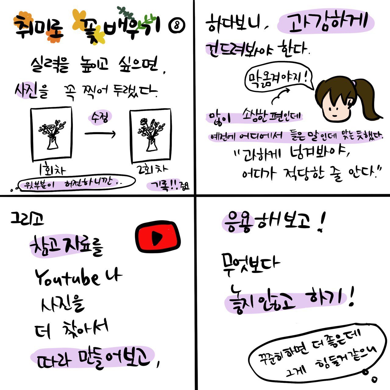 실력을 높이려면 상황을 파악하고 바꿀 것을 찾아서 고쳐야 한다. 꽃 배우는 것도 마찬가지였다. 상황을 파악하기 위해 사진을 찍는다. 눈으로만 봐서는 뭐가 뭔지 모르기 때문에. 찍은 사진을 보고 고칠 곳을 찾는다.(물론 잘한 점도 찾으면 기분이 좋으니 그것도 찾는다.) 고친 다음 다시 사진을 찍는다. 찍은 사진을 보고 잘한 점들 찾고 또 고칠 곳을 찾는다. 이러다 보면 처음보다는 실력이 오르는 걸 알 수 있다. 아, 그래서 강사님께서 사진을 꼭 찍으라고 하셨구나.