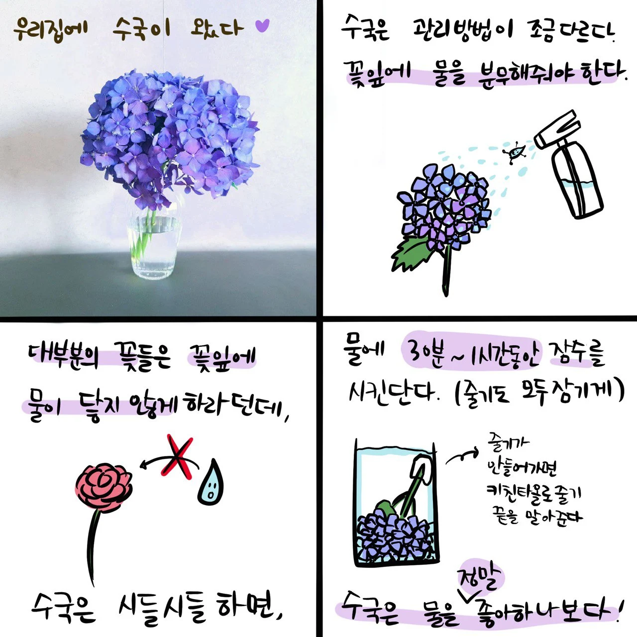 수국은 시들시들하면, 물에 30분에서 1시간 동안 잠수를 시키고 나면 다시 생생해진다고 했다. 잠수시킬 큰 통을 구하기 힘들어 비 오는 날에 비를 맞도록 밖에 내놨더니 더 생생해졌다. 신기했다. 그 정도로 물을 좋아해서 이름이 수국인가? 물 수라는 한자를 쓴 건가?