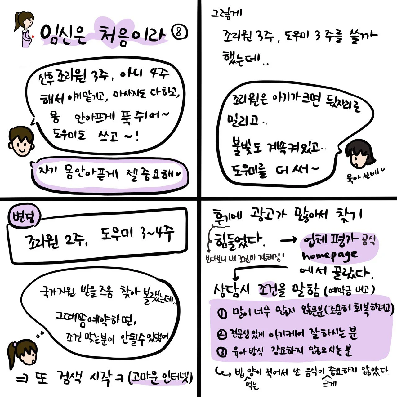 "남편이 조리원 4주 하라는 거 3주만 하고, 도우미 국가지원 2주 기본이니깐 추가로 한 주 더 하려고~"