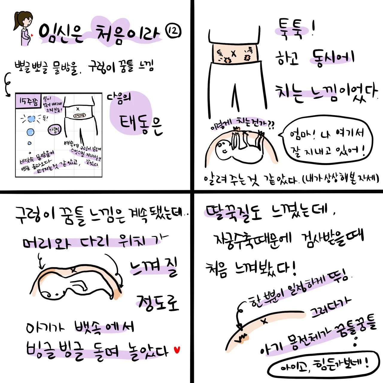 '많이 움직이고 많이 차고 놀아~! 엄마가 수축 때문에 잘 못 움직여서 아쉬워. 걸어주고 운동해 주면 좋다고 했는데.. 우리 아가야, 가끔 아프게 차도, 세게 쳐서 엄마를 깜짝 놀라게 해도 되니깐 많이 움직이며 건강하게 지내!'
