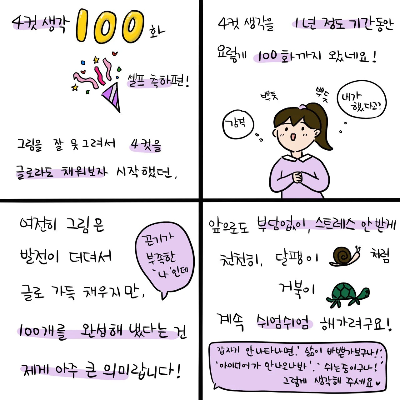 1년 정도 기간 동안 놓지 않고 해왔고, 100화라니, 정말 정말 제가 대견스럽습니다. 아, 셀프 축하나 칭찬 같은 거 자주 해주면 자존감이 올라간답니다. ㅎㅎ 누가 안 해주면, 아니, 해준다 해도 일단 내가 먼저 나서서 나를 칭찬해 줘야죠! 나 스스로 날 키워줘야죠. 이런 게 내적 보상! 앞으로도 이어갈 수 있는 힘이 된다네요.