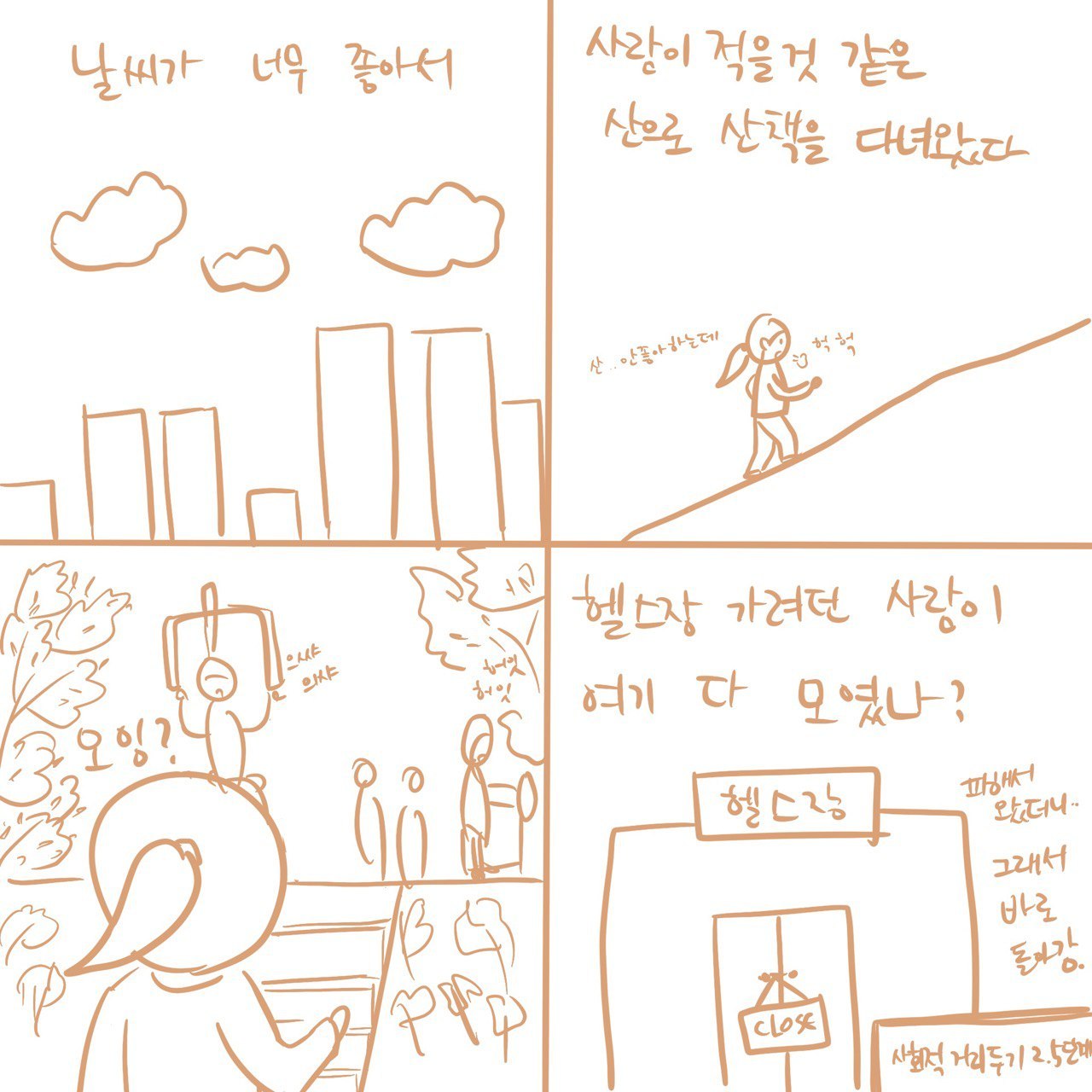 오늘도 그럴 거라 생각하고 헉헉 숨을 가쁘게 내쉬며 힘들게 올라갔다. 그런데 운동기구가 있는 곳에 5명의 사람이 운동을 하고 있었다. '아니! 평소에는 거의 사람이 없는데 여기 왜 이렇게 사람이 많지?' 생각보다 많은 인원에 놀라서 얼른 그곳을 벗어나서 집으로 갔다. 그 후, 인터넷을 검색하다가 발견한 뉴스.