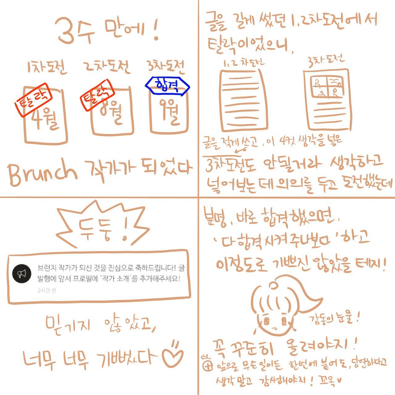 놀랍게도 승인이었다!!! 3번의 도전 중 자기소개나 목차를 가장 적게 쓴 거 같은데 말이다. 직접 그린 그림에 글을 함께 담아서 좋아서였는지, 인스타 팔로워가 좀 있어서 그런 건지, 짧지만 소개가 눈에 들었는지, 무슨 이유에서인지는 모르겠지만 어찌 되었든 작가가 되다니 너무 기분이 좋았다! 사실 한번 만에 되었으면 브런치 작가는 아무나 되는 건가 싶어 작가 승인의 소중함을 몰랐을 것 같다. 여러 번 도전해서 되니깐 더 감격스러웠다