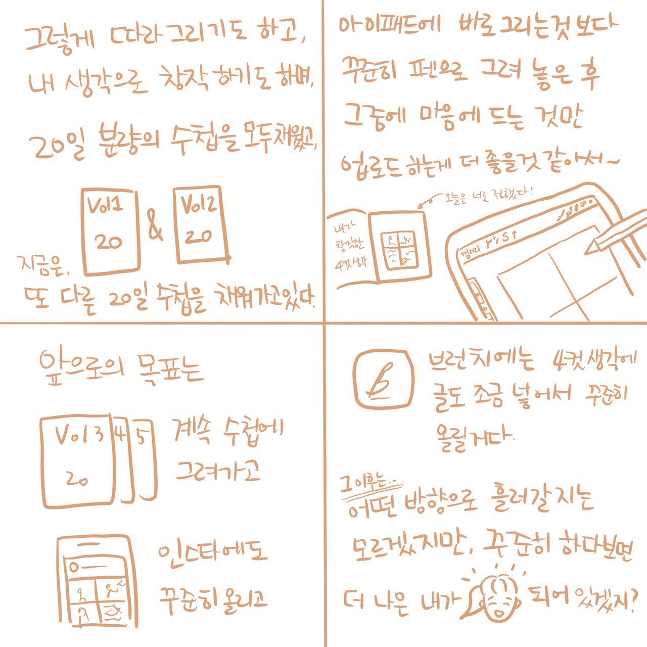 그렇게 최종 목표에 따라서 지금은 꾸준히 해나가고 있다. 먼저, 수첩에 글로 메모를 하고 그걸 4컷에 배치한 다음, 그릴 수 있는 것만 그림을 그려 글 사이에 넣고 있다. 완성된 그림을 인스타그램에 제목만 써서 올린다. 그리고 <4컷 생각> 그림에 맞는 글을 차근차근 써서 브런치에 올리고 있다.