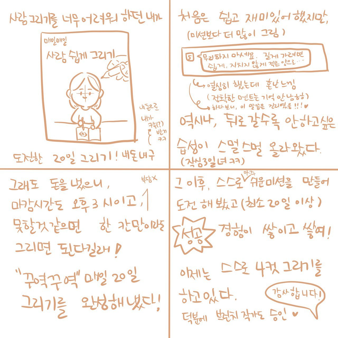 인물 그리기를 해서 뭘 하고 싶었냐면, 4컷 만화를 그려보고 싶었다. 일상이나 생각을 담은 만화를. 그래서 인물 쉽게 그리기 모임이 끝나고 다음은 스스로 20일 프로젝트를 정했다. 20일 동안 매일 4컷 만화 그리기로!