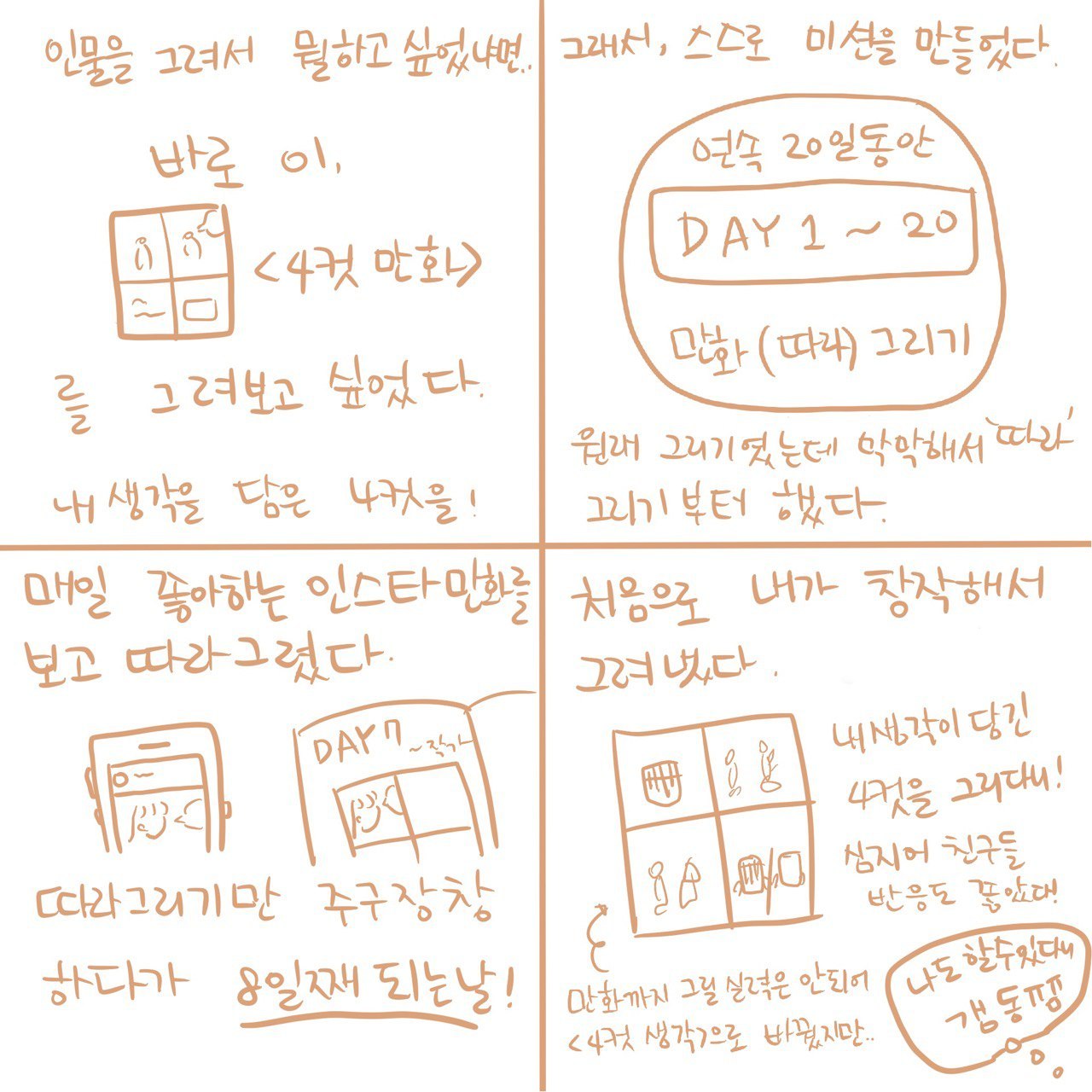 그렇게 매일 따라 그리기만 하다가 8일째 되는 날, 내 이야기를 담고 싶은 욕구가 생겨서 그려봤더니 되었다. 난 못할 거라 생각했었는데, 4컷 만화가 완성되었다! 친구들에게 보여주니 반응도 좋았다. 나도 할 수 있다니.. 정말 감동이었다.