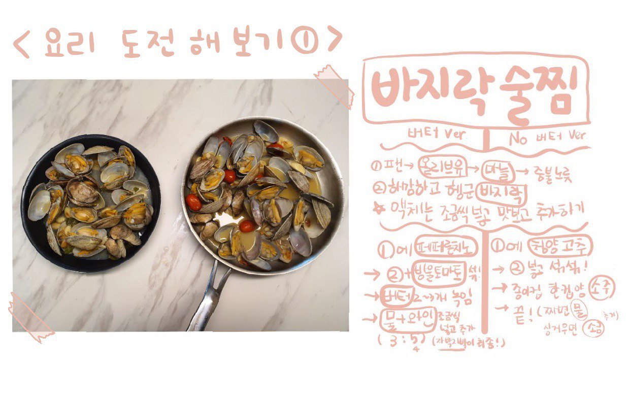 지난번에 실패한 바지락 술찜 요리에 재도전했다. 거의 한 달 만에 도전할 마음이 생겼다. 그때의 실패 요인을 찾아보면, 첫째는 냉동 바지락살을 사용한 것이다. 국물이 우러나오지 않은 느낌이었다. 그래서 이번에는 바지락 살이 아닌 살아있는 왕바지락을 주문했다. 두 번째는 버터가 녹지도 않았는데 넣자마자 물을 부어버렸다. 재료에 스며들 시간을 주지 않은 것 같았다. 마지막은 물을 너무 많이 부어버린 것이다. 거의 라면 끓이듯이 넣어버렸던 게 실수다.(여기서 물이란 건 물과 와인을 합친 건데 편의상 저렇게 썼다)
