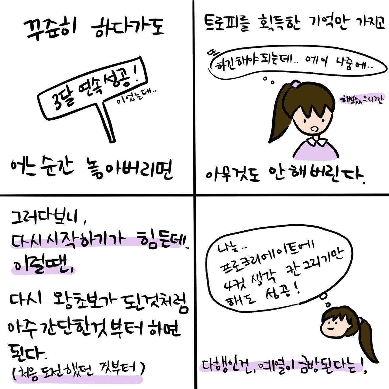 프로젝트 정하고 실천해 본 많은 도전들을 통해, 기간을 정해 꾸준히 하는 것에 이제는 자신이 있다.(원래 꾸준히 하는 것에 젬병이었다. 작심삼일녀였음.) 100일 글쓰기도 도전해서 성공했고, 매일 그림 그리기도 40일을, 습관 고치기도 3달을 성공했었다. 이 <4컷 생각> 시즌 1도 매일 30일 올리기도 완성했다. 하지만 성공을 한 이후 모두 저 멀리 던져버린다. '난 성공했어'란 트로피를 타고나면 말이다.