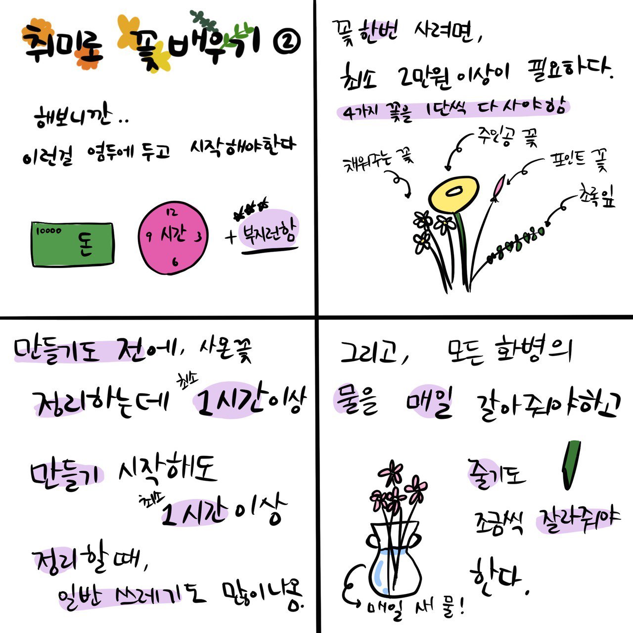 아무튼 예쁜 꽃을 다루는 걸 배워보고 싶으면, 이런 귀찮은 일들이 있고, 돈이 든다는 점을 미리 알고 있으면 좋을 것 같다. 나의 귀차니즘이 발동하면 또 그만둬버릴 것 같지만, 그럼에도 불구하고 예쁜 꽃을 보면 기분은 좋아지니 완전히 놓지는 않을 것 같다.