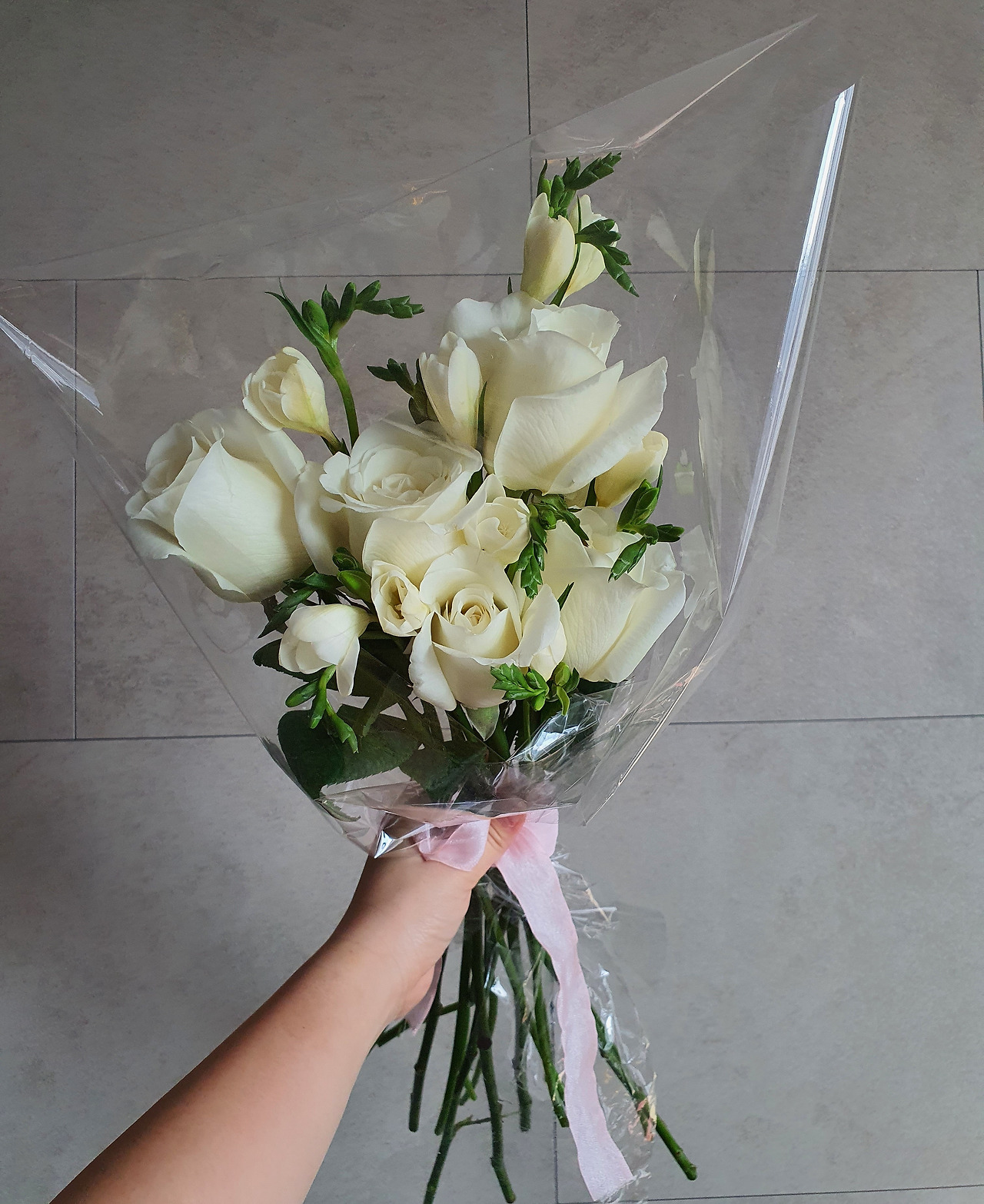 그래서 내 예산에 맞게 주인공, 조연, 그린 소재, 포인트 딱 한 개씩 4단만 사 와서 만들었다. 첫 부케 작품은 소심해서 깨작깨작 잡아서 듬성듬성한 느낌이 들었지만 꽃다발로 포장을 하니 예뻤다. 꽃집에서 2만 원 정도 하는 꽃 적게 들어간 저렴한 꽃다발은 내가 충분히 만들 수 있겠다는 생각이 들었다. 아, 이 강의에는 꽃다발 포장법은 없어서 유튜브에서 더 찾아서 보고 만들었다.