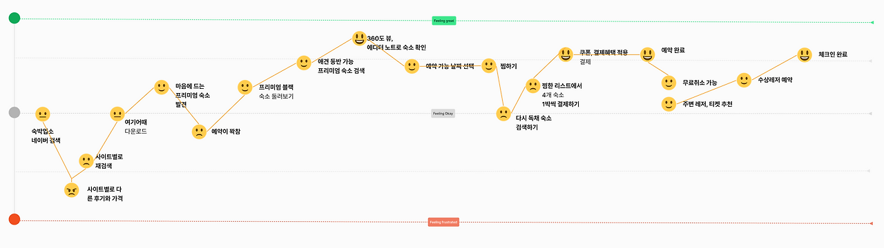 중점적으로 볼 부분은 어떤 부분에서 사용자가 긍정적, 부정적 경험을 겪느냐?입니다. 페르소나 고객은 여행을 떠나려는 목적을 이루기 위해 단계별로 문제를 겪고 있습니다. 이런 문제를 여기어때는 어떻게 풀어내고 있는지 유저 저니 맵을 통해 확인할 수 있습니다.