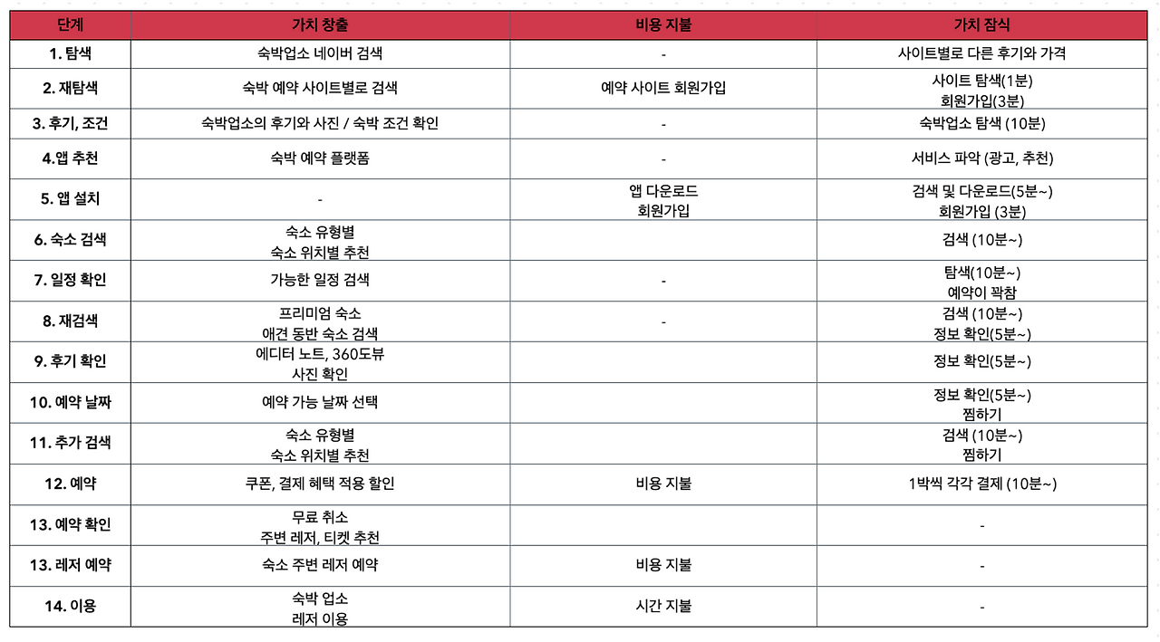 [숙박 예약 플랫폼을 통해 숙박 시설을 예약하고자 하는 사람의 고객 가치 사슬]
