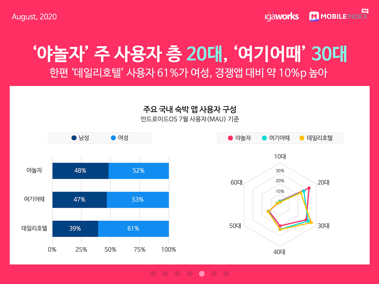 실제로도 여기어때는 여성의 이용 비율이 높았으며 야놀자에 비해 20대 비율이 낮고, 30대의 비율이 높았습니다.