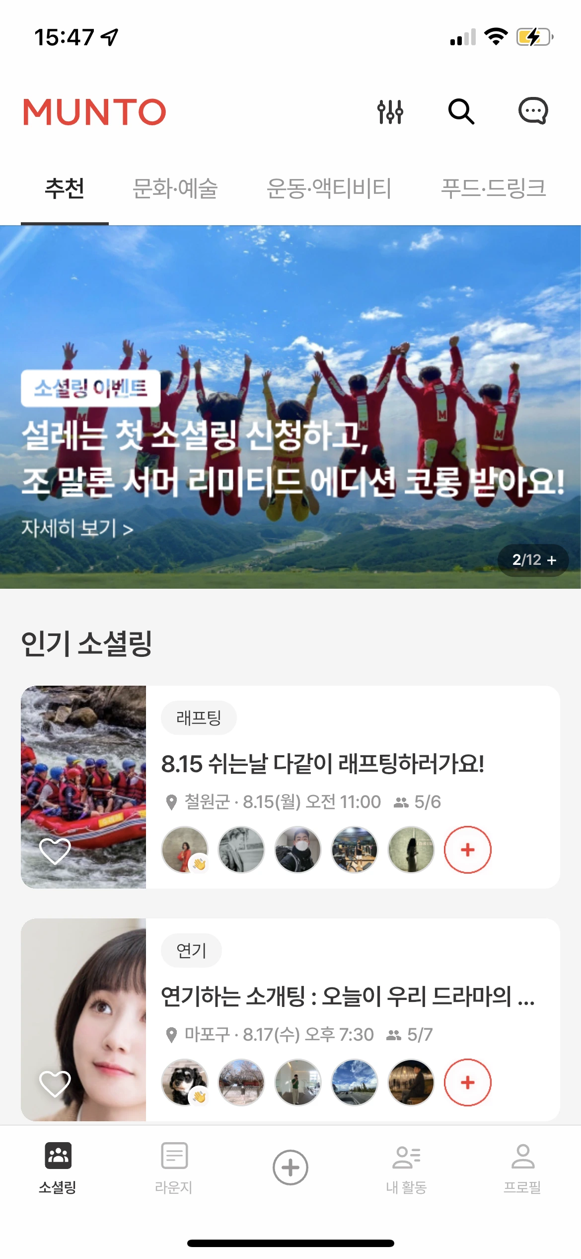 취향은 정말 다양하고 유저마다 관심사가 다 다르다. 문토는 온보딩 단계에서 유저가 관심 있는 카테고리를 파악한 후 홈 화면 첫 번째 페이지에 추천 소셜 링(모임)을 노출한다.