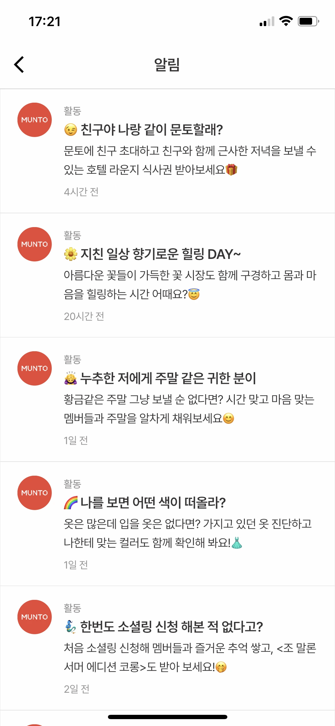 소셜 링 어플이 '만남'이라는 그 자체의 목적에만 집중해서 즐길 콘텐츠가 부족한 경우를 많이 봤는데 문토는 굳이 소셜 링을 하지 않아도 요즘 어떤 취미나 모임이 있나 그저 보기만 해도 재밌다.