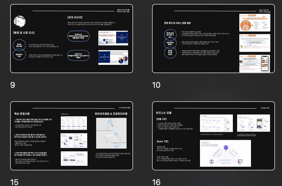 여기서 가장 지양해야 하는 것은, '산출물' 위주의 포폴을 만드는 것입니다. 저도 처음에는 열심히 작성한 기능 정의서, UXUI 화면을 보여주는 것에 급급해서 산출물 사진을 중심으로 구성해서 만들었는데요. PM 업무에서 가지고 있는 생각이나 장점을 충분히 드러내기에 부족한 포폴 구성이라는 피드백을 많이 들었습니다. 부끄럽지만 실제 제 예시를 보여드릴게요.