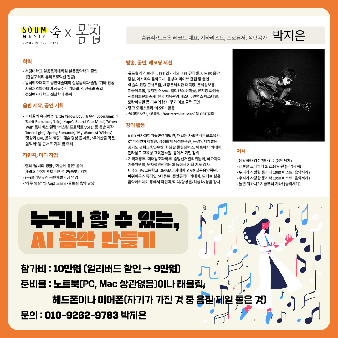 기타리스트, 프로듀서, 작편곡가, 노크온 레코드 & 숨뮤직 대표, AI 음악 강사 박지은(MyMars)입니다.