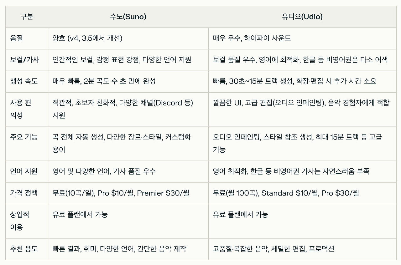 Suno, Udio, Riffusion 등 각기 다른 개성과 강점을 지닌 도구들을 비교하고, 자신에게 가장 잘 맞는 플랫폼을 현명하게 선택해 활용한다면, 흔해진 AI 생성곡들 사이에서 분명한 차별성과 자신만의 색깔을 만들어낼 수 있을 것입니다.