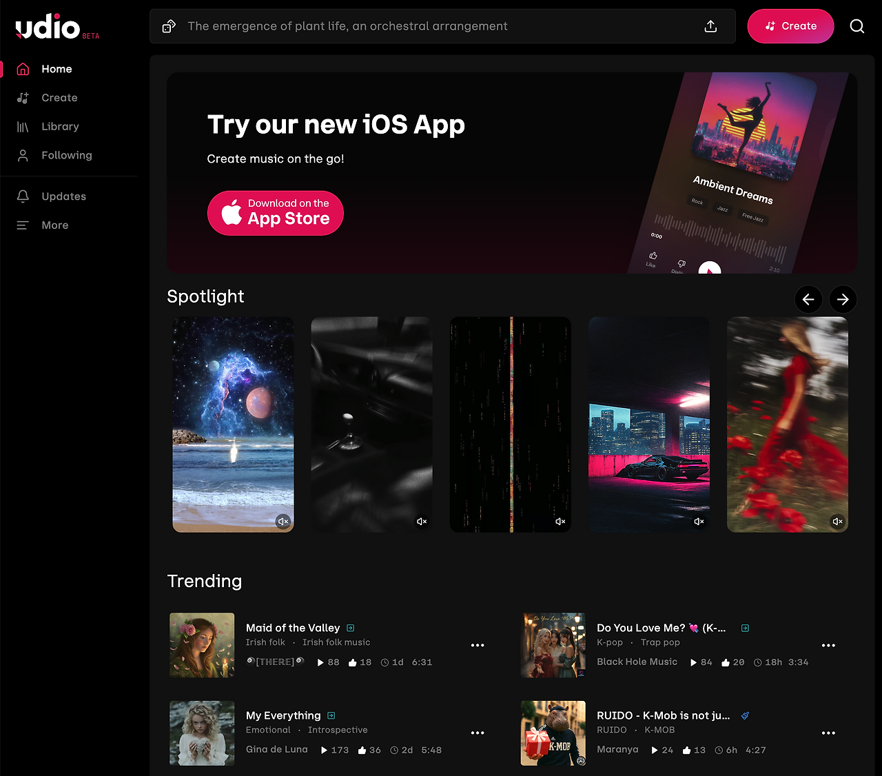 유디오는 공식 iOS 앱을 출시하여, 이제 아이폰에서도 음악 생성과 감상이 가능합니다.
