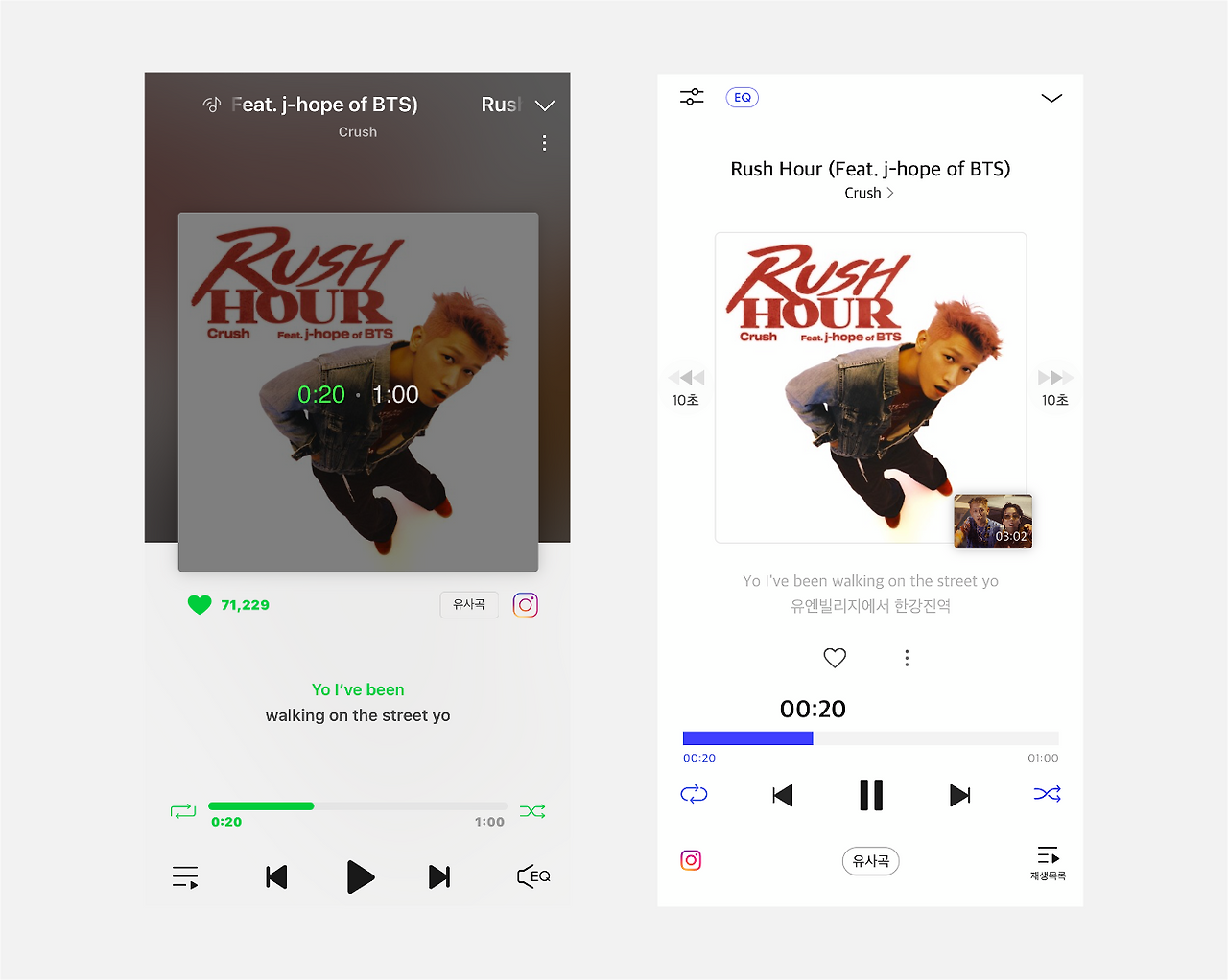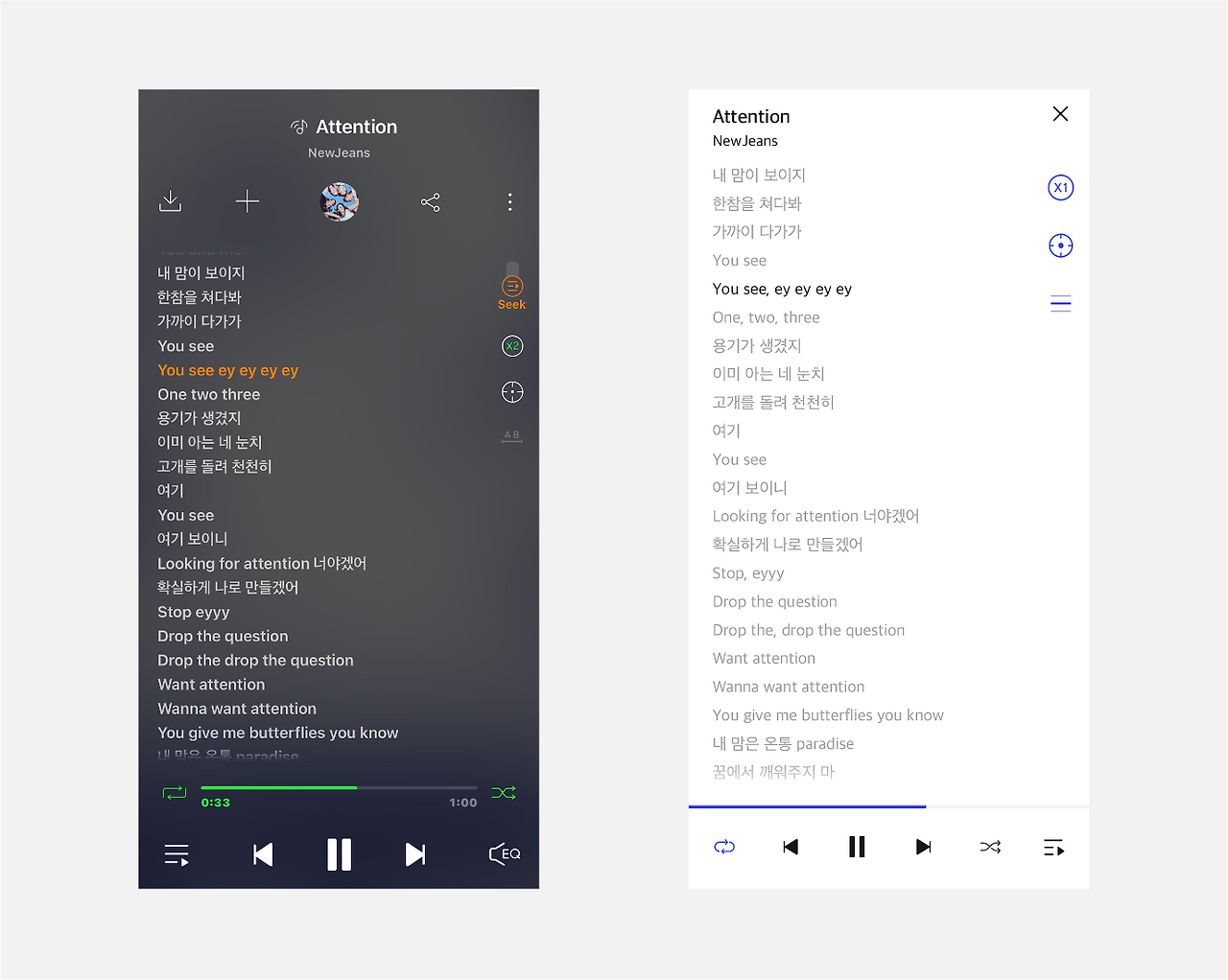 전반적으로 멜론과 플로의 가사 기능은 유사합니다. 가사 폰트 크기 설정, 현재 가사 위치 추적, 가사 터치 구간 재생이 있으며, 멜론은 구간을 반복할 수 있는 기능도 제공합니다. 기능 자체에서는 큰 차이를 볼 수 없었고, 사용자에게 어떤 경험을 제공하고 싶은지에 초점을 맞추면 확연히 두 어플의 차이가 드러납니다.