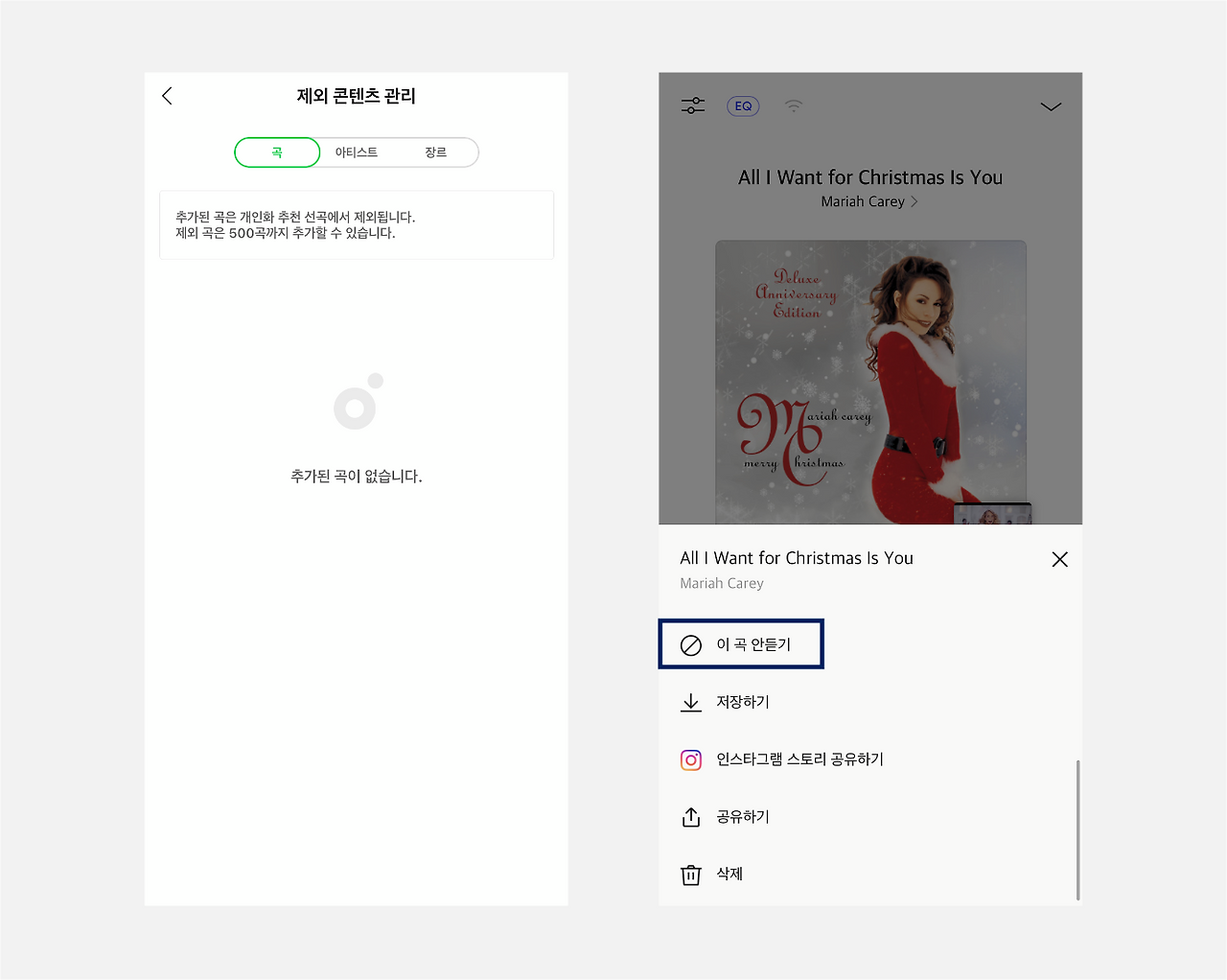 멜론도 '제외 콘텐츠 관리'라는 기능이 있는데 개별 곡은 도대체 어디서 어떻게 제외하는 건지 모르겠습니다. 플레이어 화면에도 기능이 안 보이던데... 일단 서비스는 있긴 합니다.