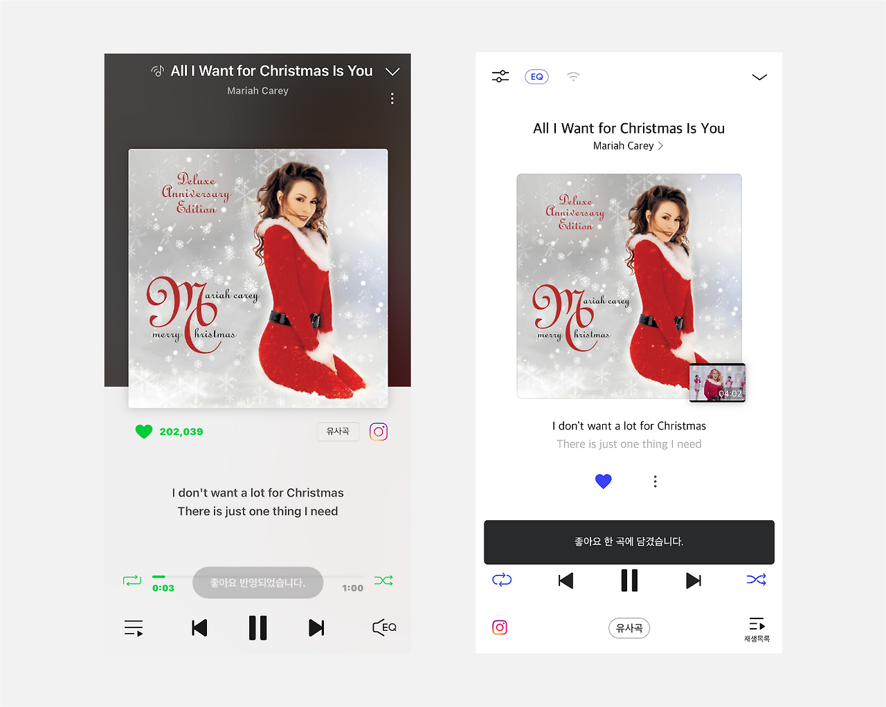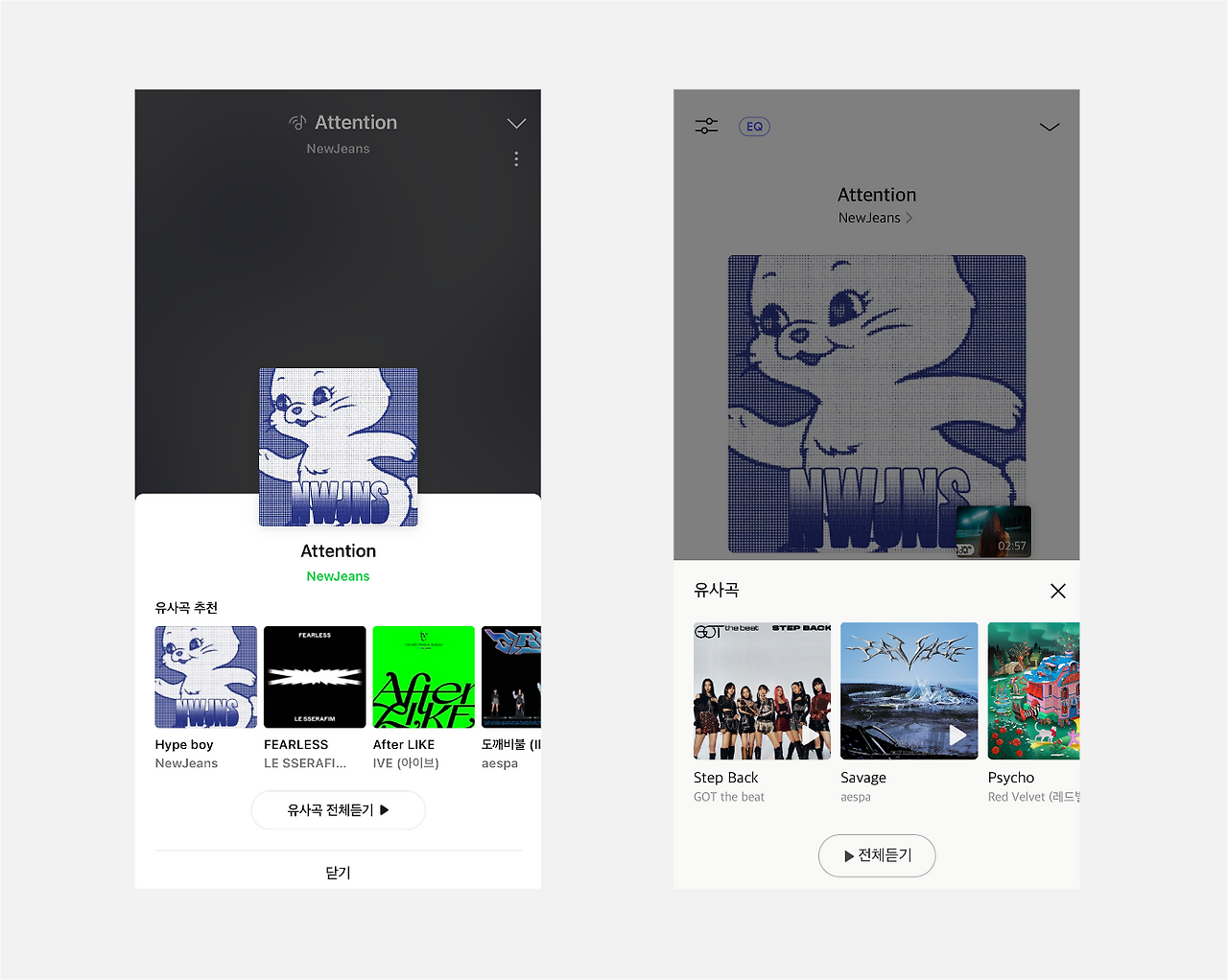 두 앱에서 공통적으로 아쉬웠던 부분은 '플레이리스트에 담기' 기능을 플레이어 화면에 노출된 '유사곡' 버튼이 아닌 케밥메뉴를 통해서 별도의 페이지로 이동해 이용해야 한다는 점이었습니다. 타 플랫폼의 경우에도 플레이리스트에 담기 위해서는 별도의 페이지로 이동해서 이용해야 했습니다.