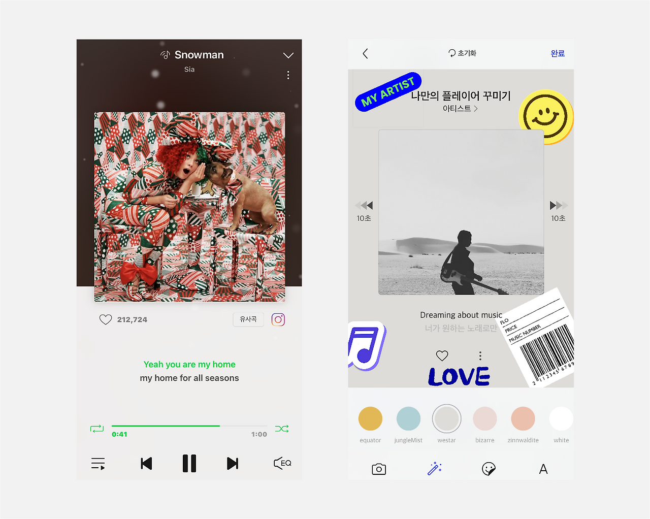 플로에서는 개인 취향에 맞춰 플레이어를 직접 꾸밀 수 있습니다. 사진이나 색상으로 배경을 지정할 수 있고, 스티커로 꾸밀 수도 있습니다. 저는 이 기능이 타사와 차별되는 플로만의 감성이라고 생각하는데 생각보다 잘 안 알려진 것 같더라고요. 멜론이었다면 플레이어 화면을 캡처해서 커뮤니티에 공유할 수 있도록 게시판이라도 만들 것 같은데 말이죠.