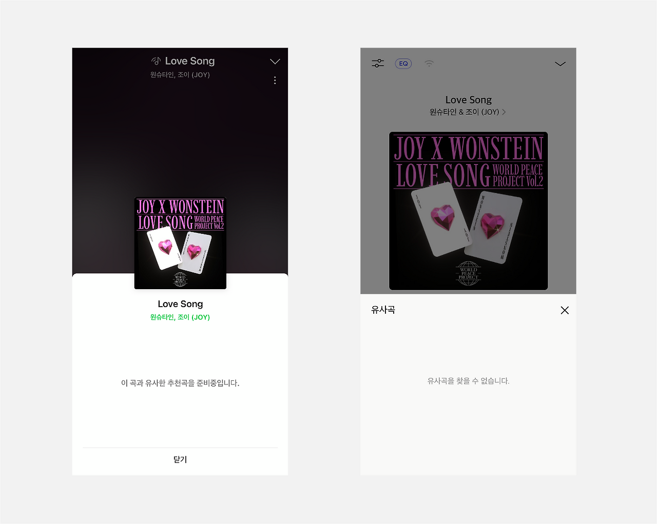 유사곡 추천에서 또 비교할 수 있었던 부분은 NULL 값을 어떻게 표시하느냐? 즉, 유사곡이 없는 노래는 어떻게 안내를 제공하는지에도 차이가 있었습니다. 멜론은 "...유사한 추천곡을 준비 중입니다"라는 내용으로, 플로는 "유사곡을 찾을 수 없습니다"라는 내용으로 안내를 제공하였습니다. 사용자 입장에서는 멜론의 문구가 더 친절하게 와닿을 수 있을 것 같습니다.