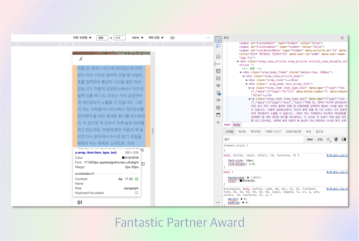 브라우저로 접근 가능한 웹 서비스라면 개발자 도구로 구성요소를 확인할 수 있습니다. 현재는 주로 개발자 도구를 검수할 때 사용하고 있는데요. 특히, 모바일의 경우 최소 320px에서 모든 요소가 제대로 나오는지, 텍스트가 영역을 초과할 때 줄 바꿈이나 말 줄임 처리가 되는지, 화면 너비 축소 및 확대에 따라 요소가 적절하게 처리되는지 등등을 검수할 수 있습니다.