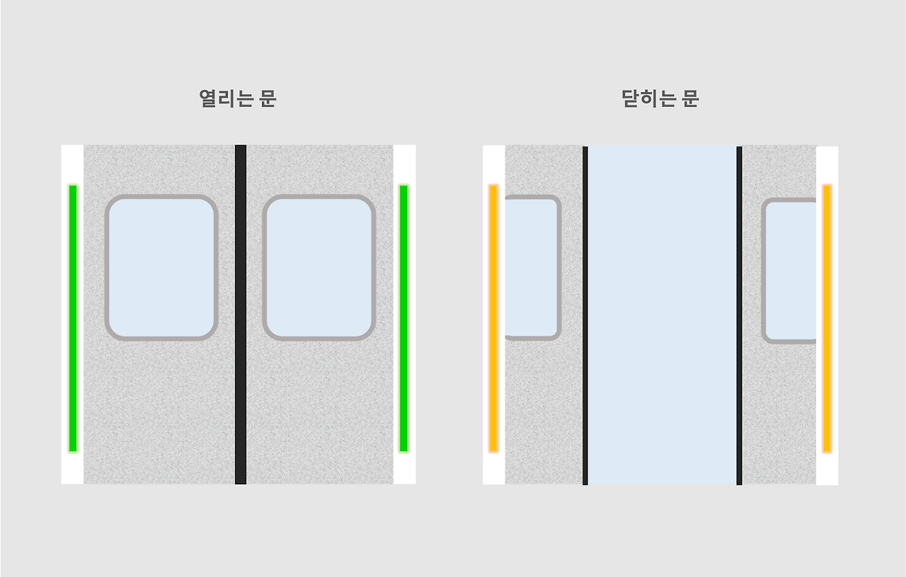 그럼에도 불구하고 지하철에서 개선된 부분도 많이 볼 수 있습니다. 신식 지하철에서는 출입문 양옆면에 달린 녹색 LED 등으로 열리는 문의 방향을 쉽게 확인할 수 있고, 문이 닫히기 직전부터는 LED 등이 적색으로 점멸되면서 경고를 하여 보다 안전하게 이용을 할 수 있습니다. 이전에는 감으로 언제 닫힐지 눈치 싸움을 했다면 새로운 방식은 이용자들에게 힌트를 제공합니다. 색상과 애니메이션을 활용하여 어떤 상태인지 알려주는 것은 앱이나 웹에서도 쉽게 볼 수 있는 장치라 반갑더라고요 :)