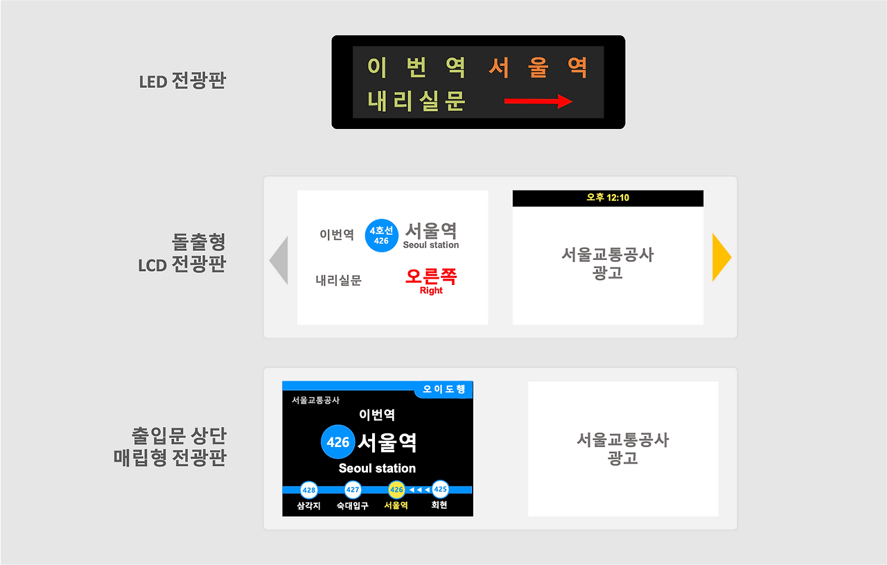 LED 전광판과 돌출형 LCD 전광판은 통로에, 매립형 전광판은 출입문 상단에 위치해 있습니다.