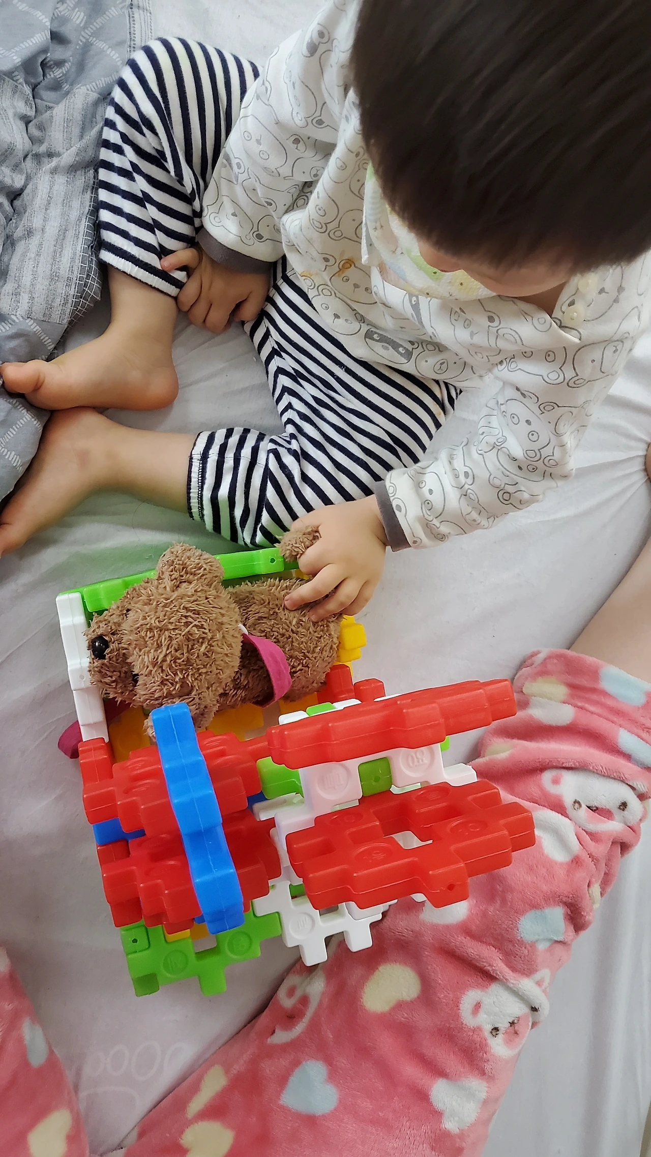 대성공이다. 돈이 하나도 아깝지 않다. 이 블럭은 36개월 이상 권장이라 쓰여있지만, 20개월 정도의 아이가 보호자와 함께 놀기에도 좋다. 플라스틱이라 다칠 염려도 없고, 이것저것 모양을 만들기가 용이하다. 아직 20개월의 힘으로 꽉 끼는 것은 어렵지만 시간이 지나니 아기도 얼추 낄 수 있다. 오후 내내 같이 강아지 집을 지어줬다. 이제 퇴원하면 저 강아지를 두고 가야 하는데, 여기 온 뒤로 강아지만 안고 다니고 안고 자고 밥도 같이 먹고 화장실도 같이 가니, 벌써 조금 걱정이 된다 ㅎㅎ