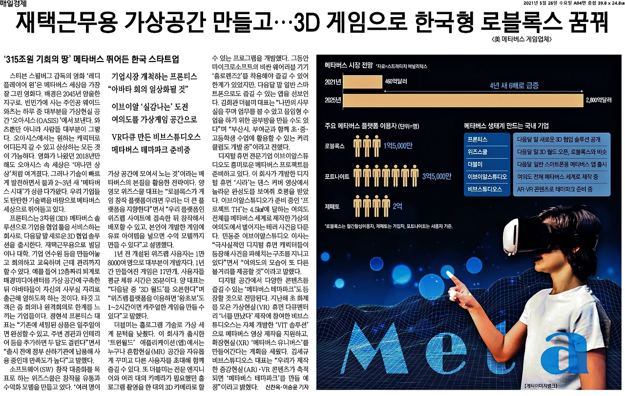 그 아바타가 현실과 접목해 세상에 다시 나오고 있다. 국내에서는 네이버를 필두로 메타버스가 성장 중이다. 워킹맘이지만 회사원은 아닌 내가 메타버스를 어떤 방식으로 처음 접하게 될지는 모르겠으나, 우선 시작은 주식으로 만났다. 직방에서는 메타버스로 사무실을 구현해 그곳으로 아바타들이 출근을 한다고 한다. 기사에는 이런 환경이 활성화되면 사무용 부동산에도 지각변동이 일거라는 예측도 있었다. 아직 조금 먼 이야기 같지만, 작년에 낯설었던 온 택트라는 말이 이제는 익숙하지 않은가. 메타버스도 조만간 현실을 파고들지도 모른다. 메타버스라는 신대륙은 부가가치도 어마어마하단다. 그 속에서 나는 어떤 자리를 차지하면 좋을지 생각도 해본다.