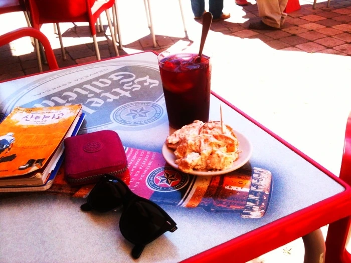 여정이 얼마나 힘든지 알고 나니 중간중간 간식으로 에너지 보충이 필요하겠단 생각이 들었다. 전날 오후에 슈퍼에서 초콜릿이나 과일, 치즈, 빵등을 사서 배낭에 쟁여두었다. 아침에는 꼭 바 Bar 에 들려 아침식사로 커피와 크로와상이나 토스트세트를 먹었다. 잼과 버터를 야무지게 빵 구석구석 발라 카페라테 Cafe con Leche와 먹으며 하루를 시작했다.
