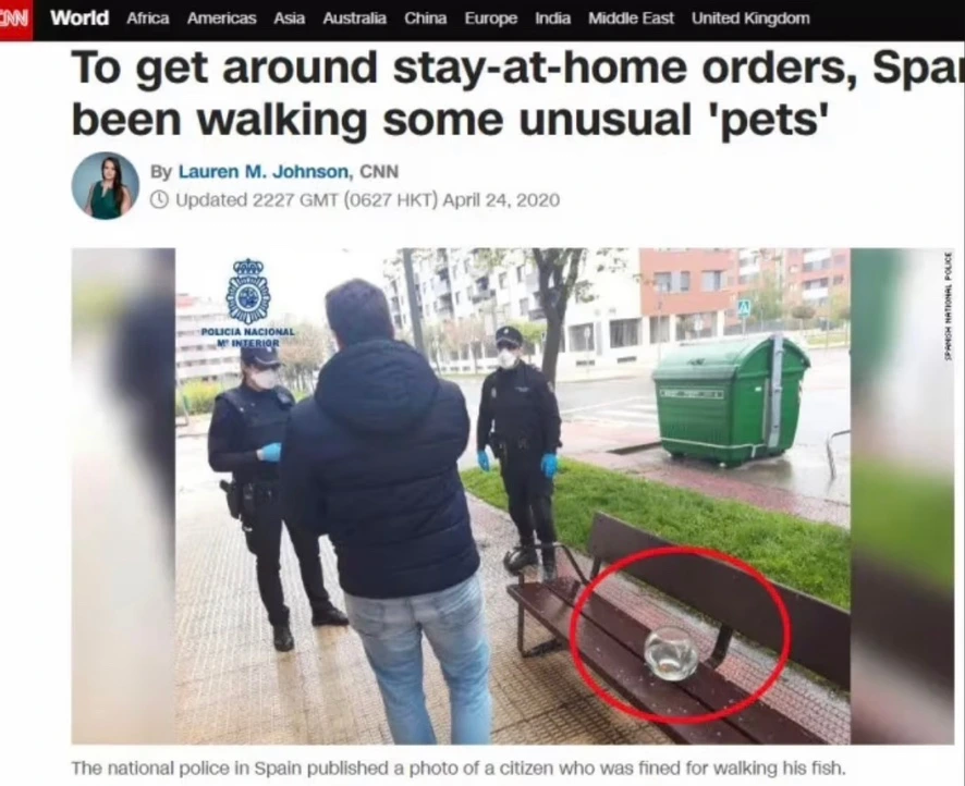 덕분에 웃긴 기사들을 발견하곤 했다. 2020년 락다운 한창일 때 밖에 나가고 싶은 누군가 반려동물 산책 가능을 이용해 물고기가 든 어항을 가지고 나왔다가 경찰에게 걸려서 벌금 냄 ㅋㅋㅋㅋㅋㅋㅋㅋㅋ