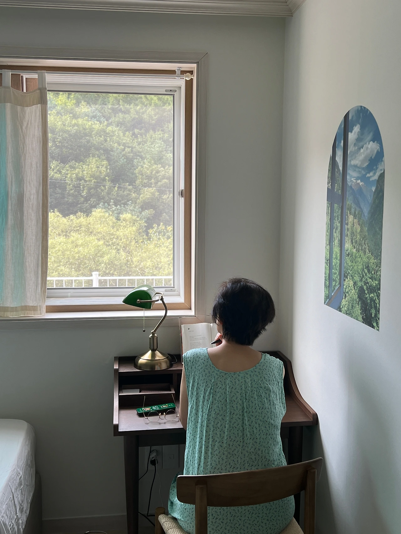 올해 엄마 생신때 함께 간 북스테이에서 창밖을 보며 방명록을 적는 모습인데 저에겐 그 모습이 꿈 같고 한편의 시 같기도 했습니다. 지극한 현실 속에 살아가지만 이런 순간들을 조금씩 쌓다보면 꿈에도 다가가겠지요?