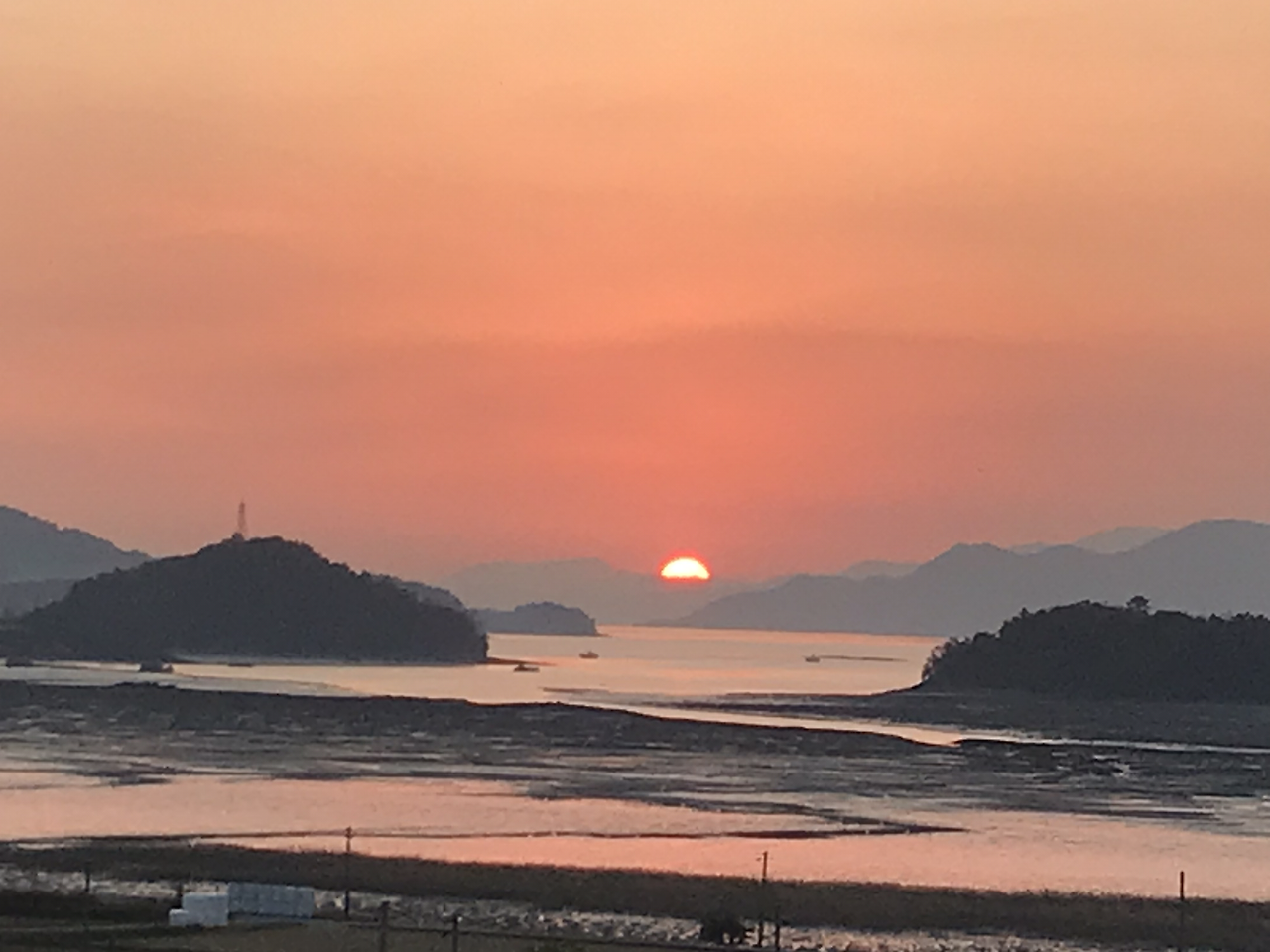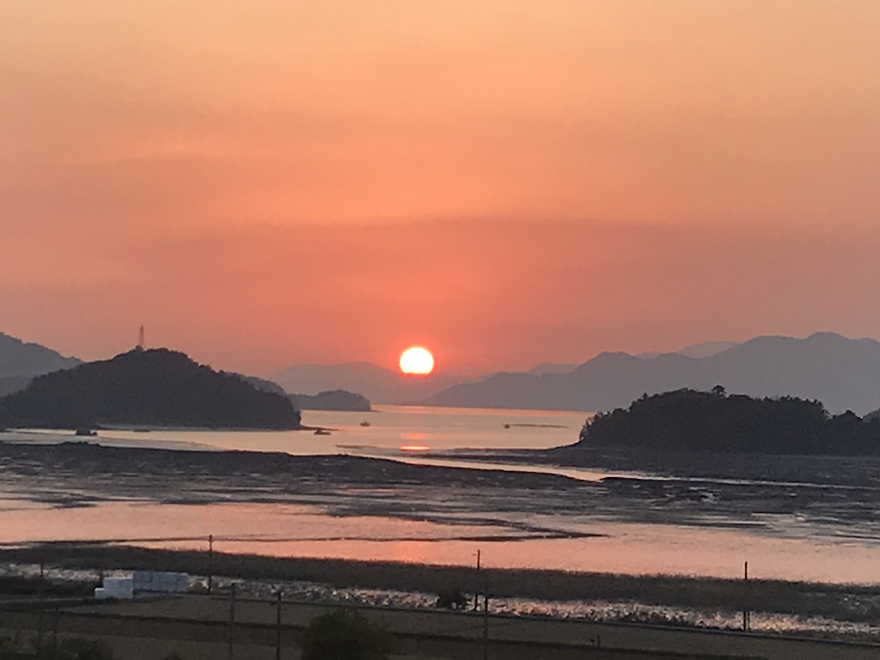 우리 말고 몇 팀이 일몰을 구경하려고 이미 도착해 있었다. 억새 넘어 너른 평야가 펼쳐지고 평야 끝에 자리 잡은 산인지 섬인지 능선 위로 해가 넘어가고 있었다. 한참 그대로인 것 같더니 산 아래로 떨어지는 건 정말 눈 깜짝할 사이였다. 장비를 제대로 갖춘 사진사와 차를 몰고 가다가 우리처럼 해넘이를 보러 온 사람들이 사이좋게 나란히 서서 찰칵찰칵 셔터를 눌렀다.