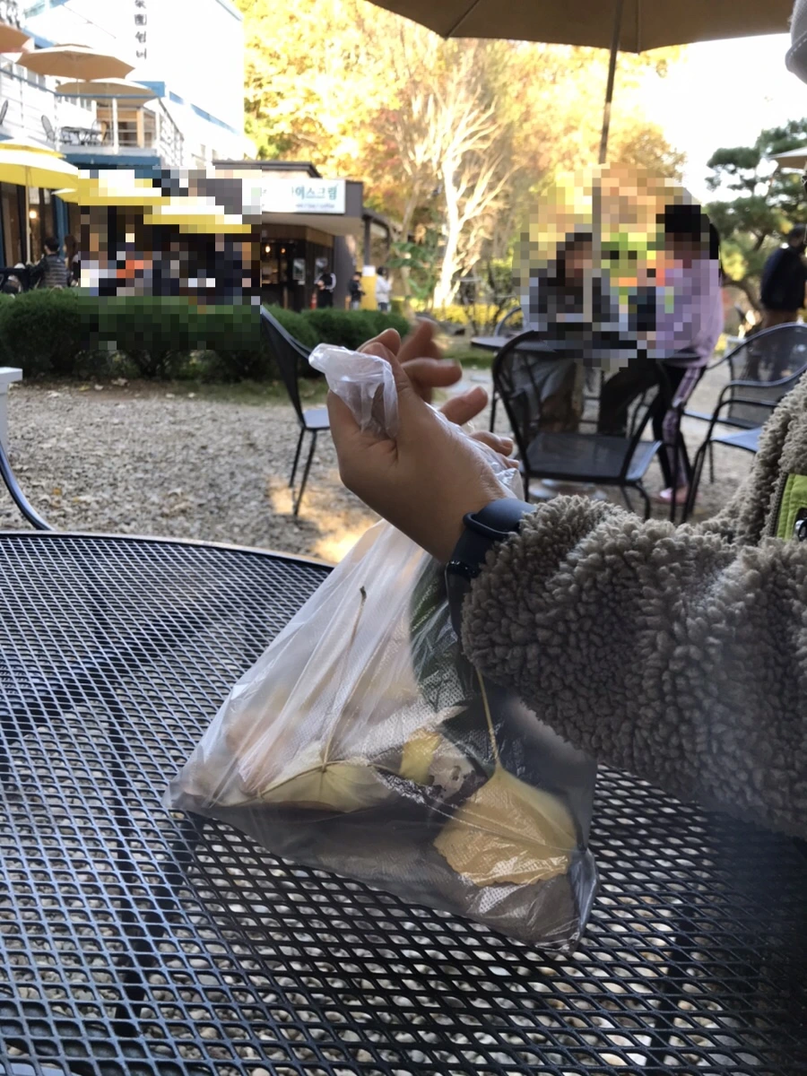 편백나무 숲으로 걸어 내려와 아이가 원하던 녹차 맛과 우유맛 아이스크림을 한 컵씩 사서 나눠먹고, 최선을 다해 떨어진 낙엽을 주워 모이는 아이를 도와주었다. 아이는 차밭의 돌멩이 몇 개와 빨갛고 노란 나뭇잎을 요즘 최애 하는 포켓몬 카드 다루듯 귀하게 챙기더니 가게에서 비닐봉지를 하나 얻어와 고이 넣어서는 손으로 꼼꼼하게 묶었다.