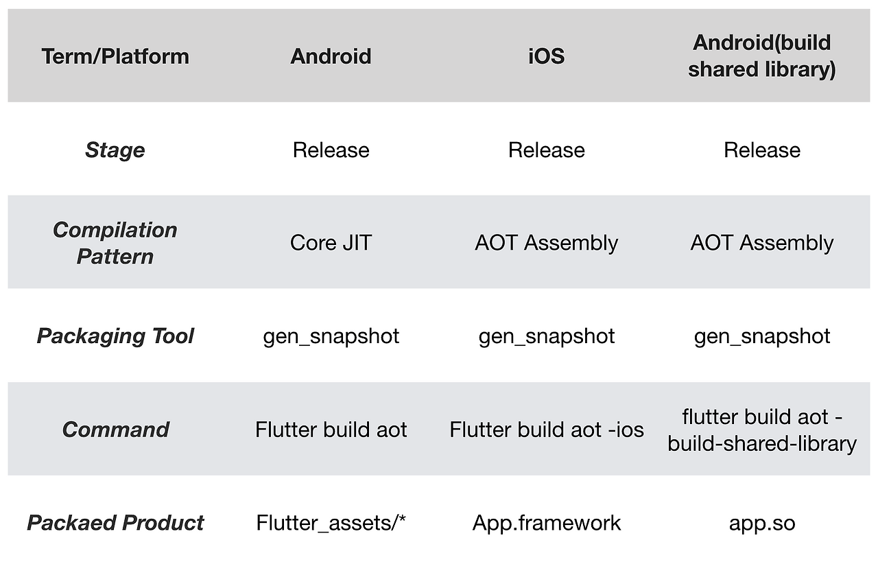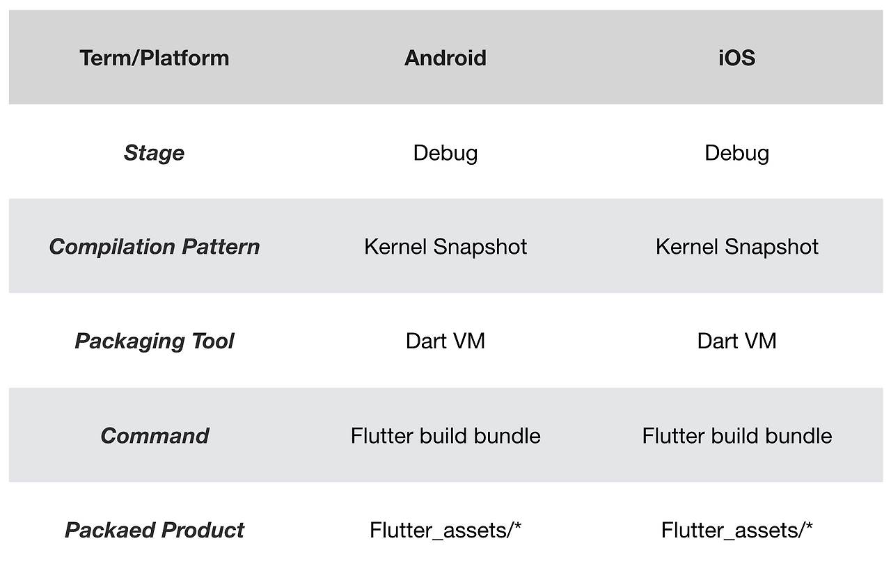 Dart로 구성되니 Dart와 같아야 하지만 Android, iOS 개발의 큰 차이로 인해 좀 다른 점이 발생하였고 구성은 Script, Script Snapshot, Kernel Snapshot, Core JIT, AOT이다. 여기서 다 비슷하지만 다른 것만 설명하겠다. Kernel SnapShot의 경우 Dart 바이트코드 모드이고 이것은 사실 Flutter Project의 Core Snapshot이라고도 불린다. Cort JIT은 컴파일된 Dart 코드의 바이너리 형식의 일종으로서, 프로그램 데이터와 명령어가 특정 바이너리 형식으로 압축되고 실제로 Core JIT은 AOT 패턴의 일종이다.