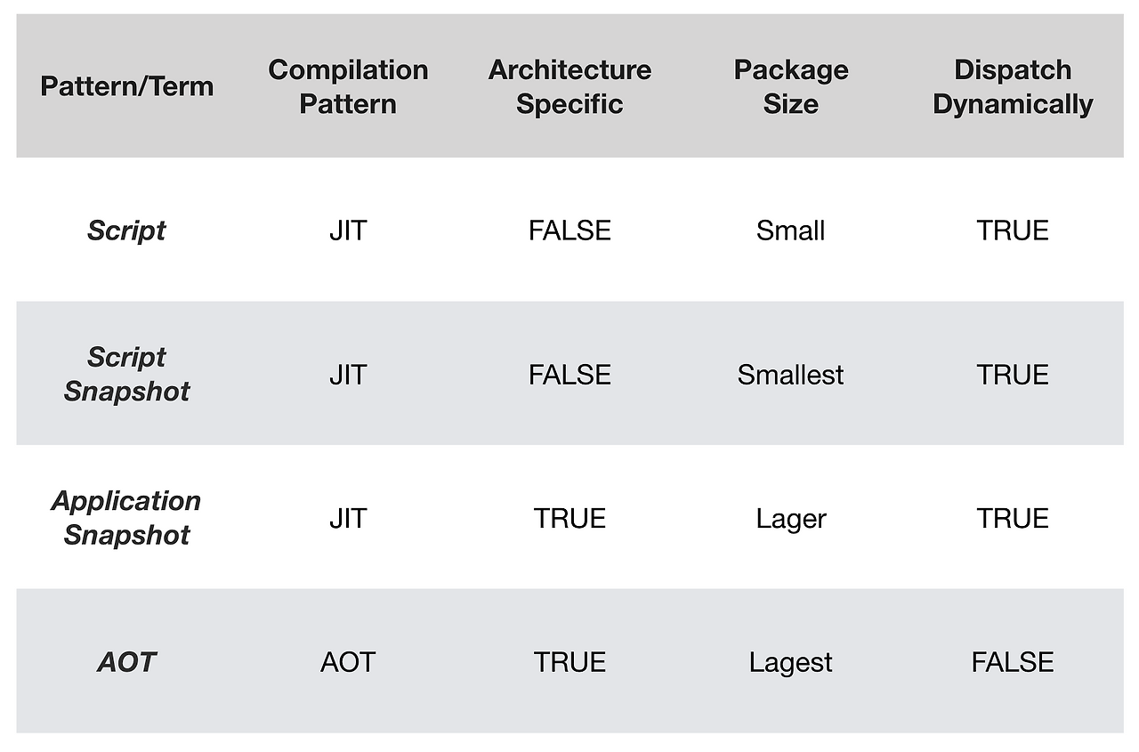 Dart의 컴파일 패턴은 Script, Script Snapshot, Application Snapshot, AOT로 나눌 수 있다.