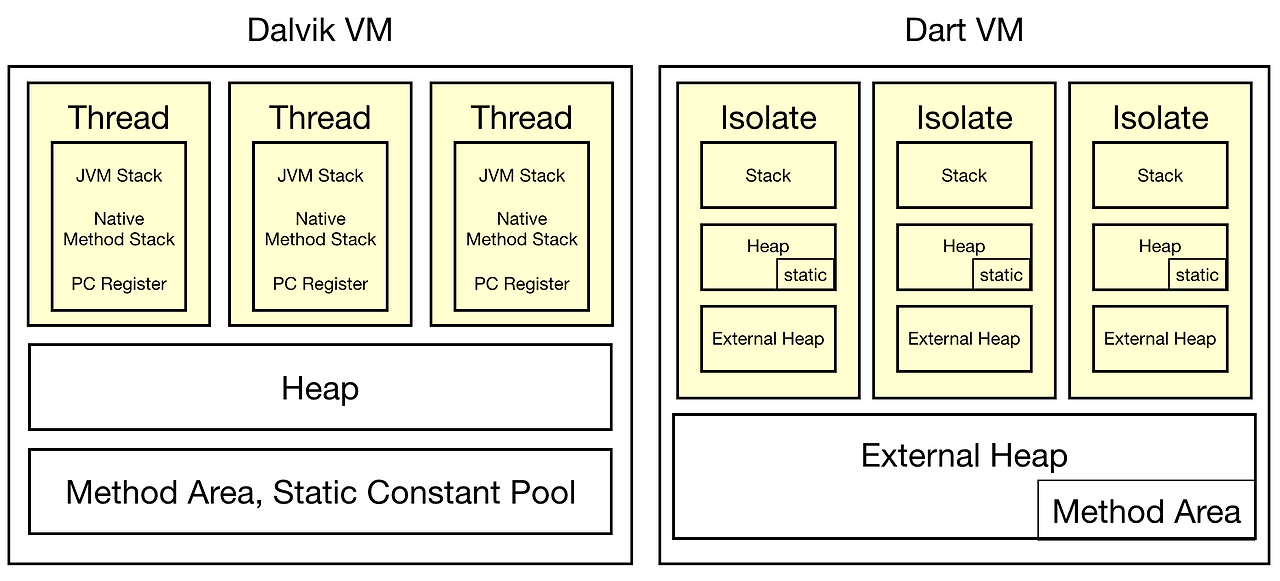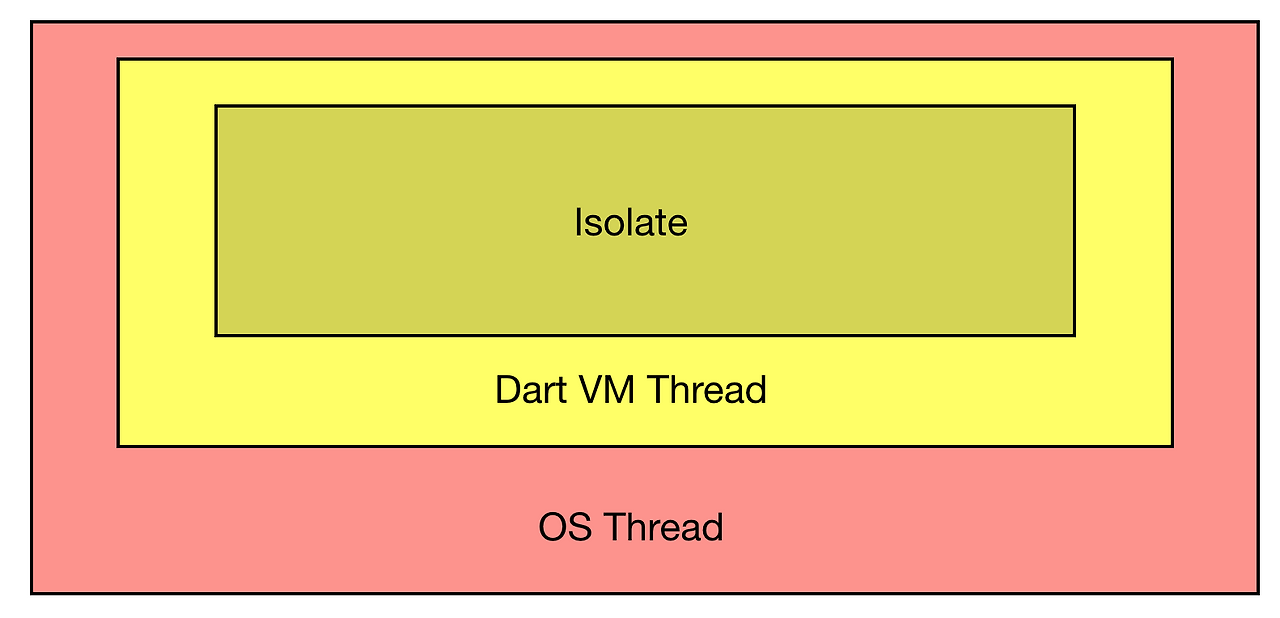 Dart의 스레드와 같은 개념을 Isolate라고 한다(https://api.dartlang.org/stable/2.1.0/dart-isolate/Isolate-class.html). 그리고 자체 관리 스레드를 생성하지 않고 Embeder가 책임진다. Embeder는 Flutter Engine에 있다. Isolate는 Isolated memory heap의 추상화이다. Isolate는 메모리를 공유하지 않는다. 본질적으로는 Self-contained Applicartion이다. Isolated 간 통신은 메시지 채널을 통해 통신한다.