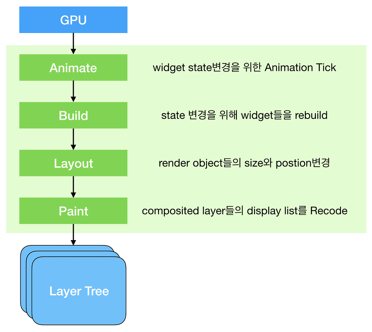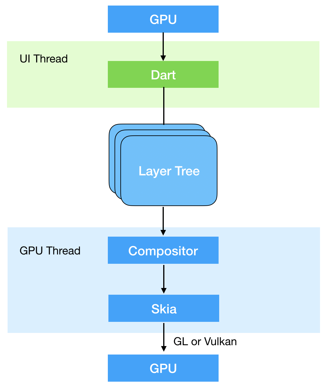 Flutter는 GPU에 뷰 데이터를 제공하고 GPU의 VSync 신호는 UI 스레드와 동기화되며 UI 스레드는 Dart를 사용하여 추상 뷰 구조를 만든다. 이 데이터 구조는 GPU 스레드에 계층화되어 있다.