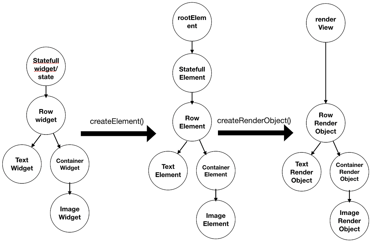 Flutter 앱을 만들고 runApp을 호출하면 rootWidget을 rootElement의 자식으로 rootElement에 전달하고, Element트리를 생성하고, Element트리에서 Render 트리를 생성한다.