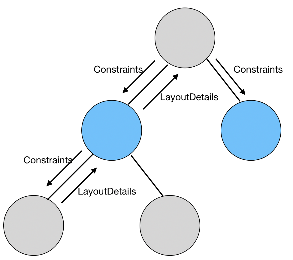 부모는 자식에게 제약조건을 계속 내려준다. 그런 다음 자식은 새로운 제약 조건을 생성하고이를 자신의 자식에게 넘깁니다. 이런 작업을 자식이 없는 리프 위젯에 도달할 때까지 계속 진행된다. 그런 다음이 위젯은 전달된 제약 조건을 기반으로 레이아웃 세부 정보를 결정한다. 바로 사이즈를 결정하는 것이다. 레이아웃에 필요한 세부 사항을 판별하고 정한 다음 이를 부모에게로 다시 전달한다.