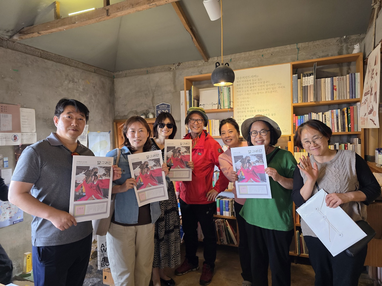 2017년 마을미디어 교육을 계기로 창간된 계간지인 '달그리안'은 올해 봄에 발간된 신문이 25호다. 책방에 들어가자마자 마을신문을 발견하고 기뻐하는데 그곳에 계신 마을 주민 몇 분들이 반가워한다. 놀라운 경험이다. 바로 그분들이 마을 신문을 만든 분들이고 지금 막 봄호(25호)를 책방에 가져놓으러 오셨던 것이다. 그들 또한 마을신문에 관심을 갖는 우리를 보고 놀라워하셨다. 더 놀라운 건 2017년에 마을미디어 교육을 진행하며 우도마을신문이 탄생하도록 도와줬던 강사님의 우리의 지인이었으며 이를 알게 된 마을 주민들께서 너무나 놀랍고 반가워해 함께 사진 촬영도 했다. 이 사진을 그 지인 강사님에게 받았다.^^