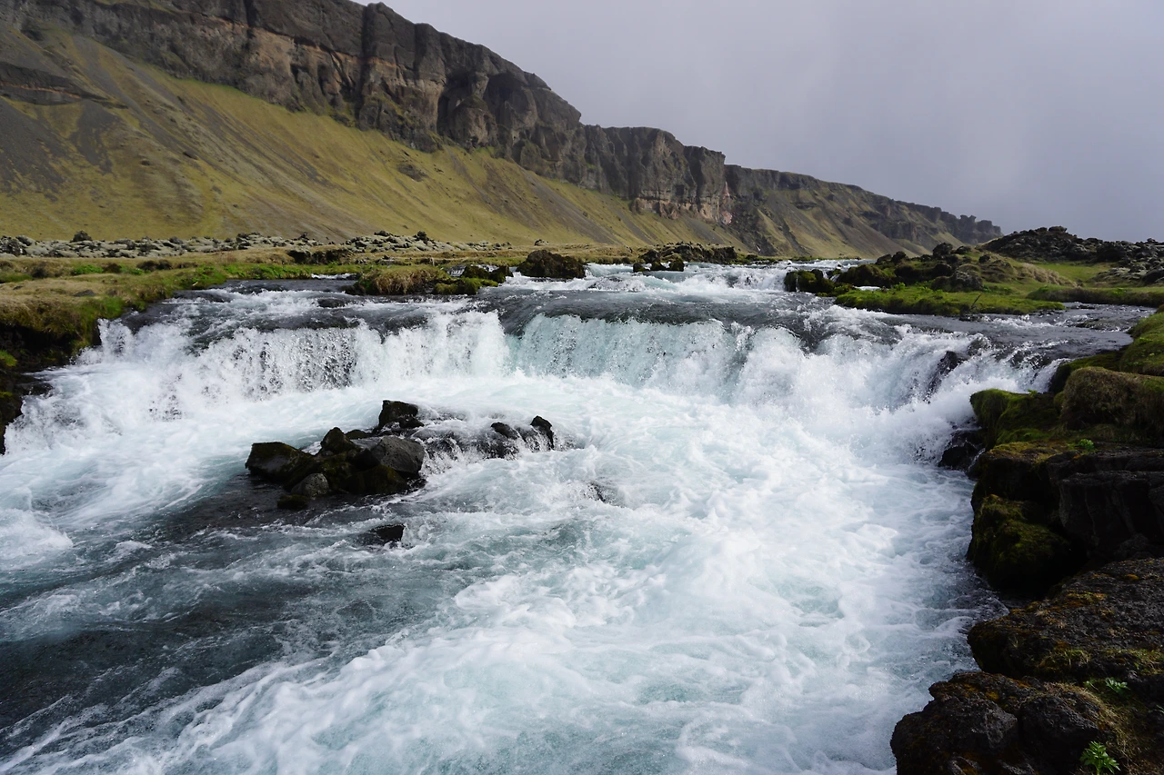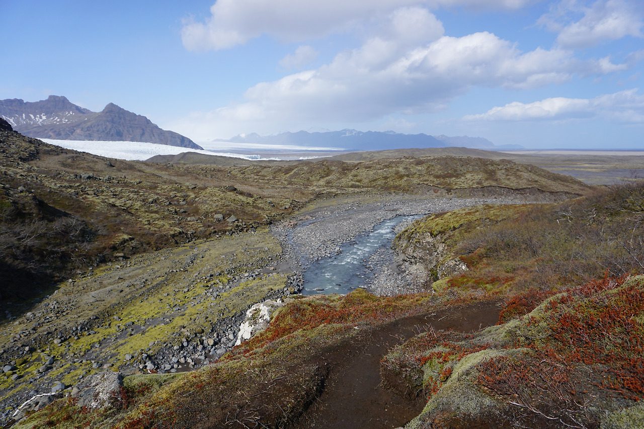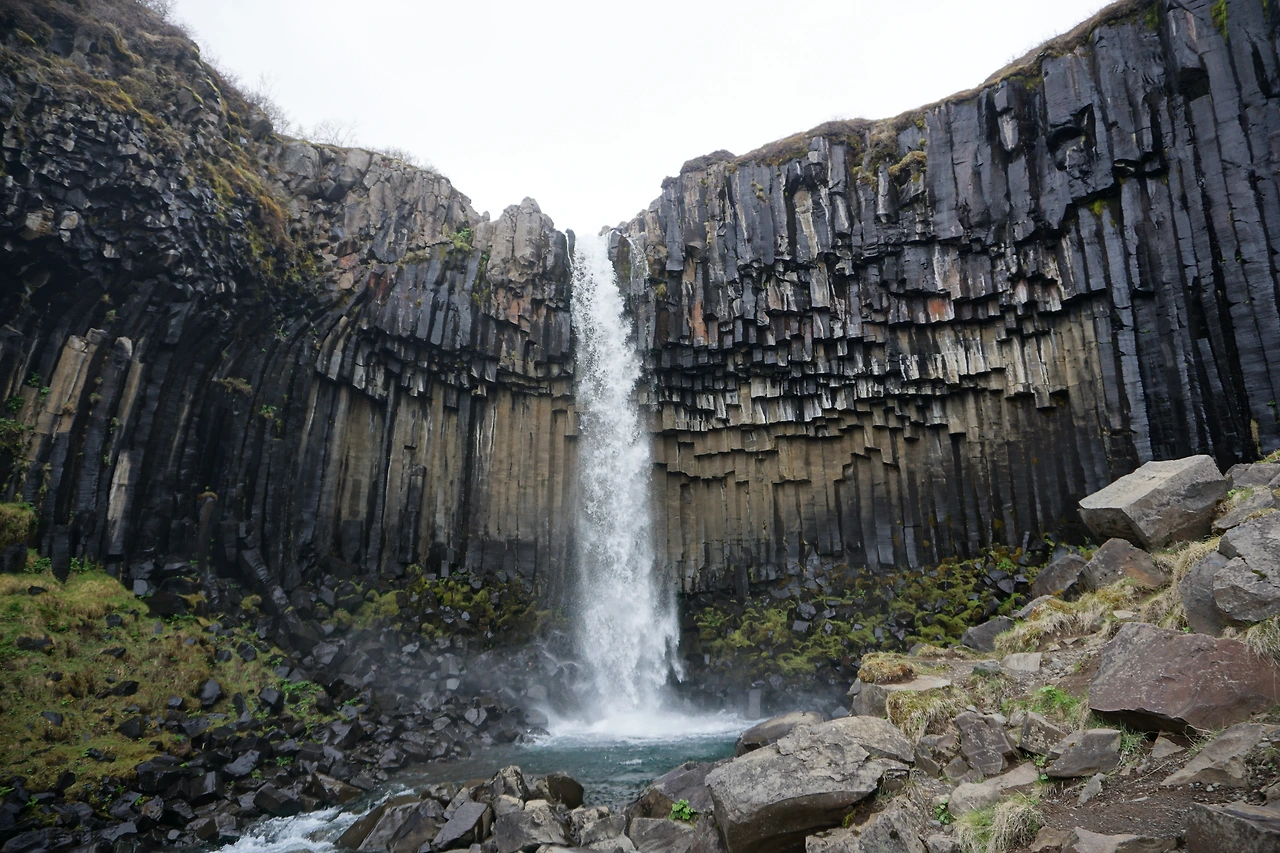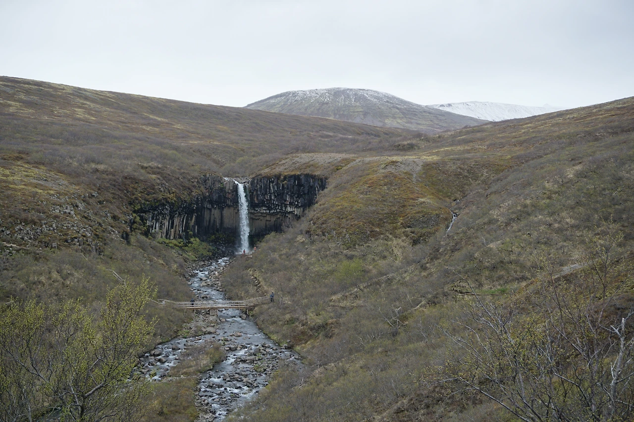 스카프타펠 빙하 바깥 한구석탱이에 있는 주상절리 폭포다. 멀리 눈 닿는 곳엔 설산들이.. 아래 사진 왼쪽 푹 파여있는 검은 지대가 스바르티포스다.
