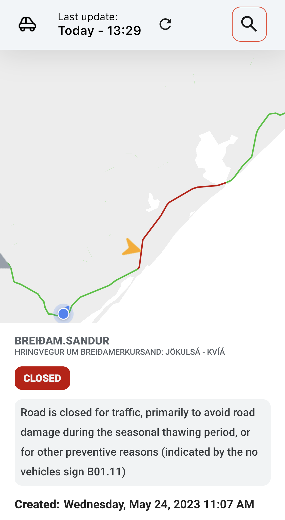아이슬란드 도로 상태를 보여주는 앱을 서둘러 켜보니 이 구간이 빨간색이다. 바람 때문에 통행불가 싸인이 떠 있다.