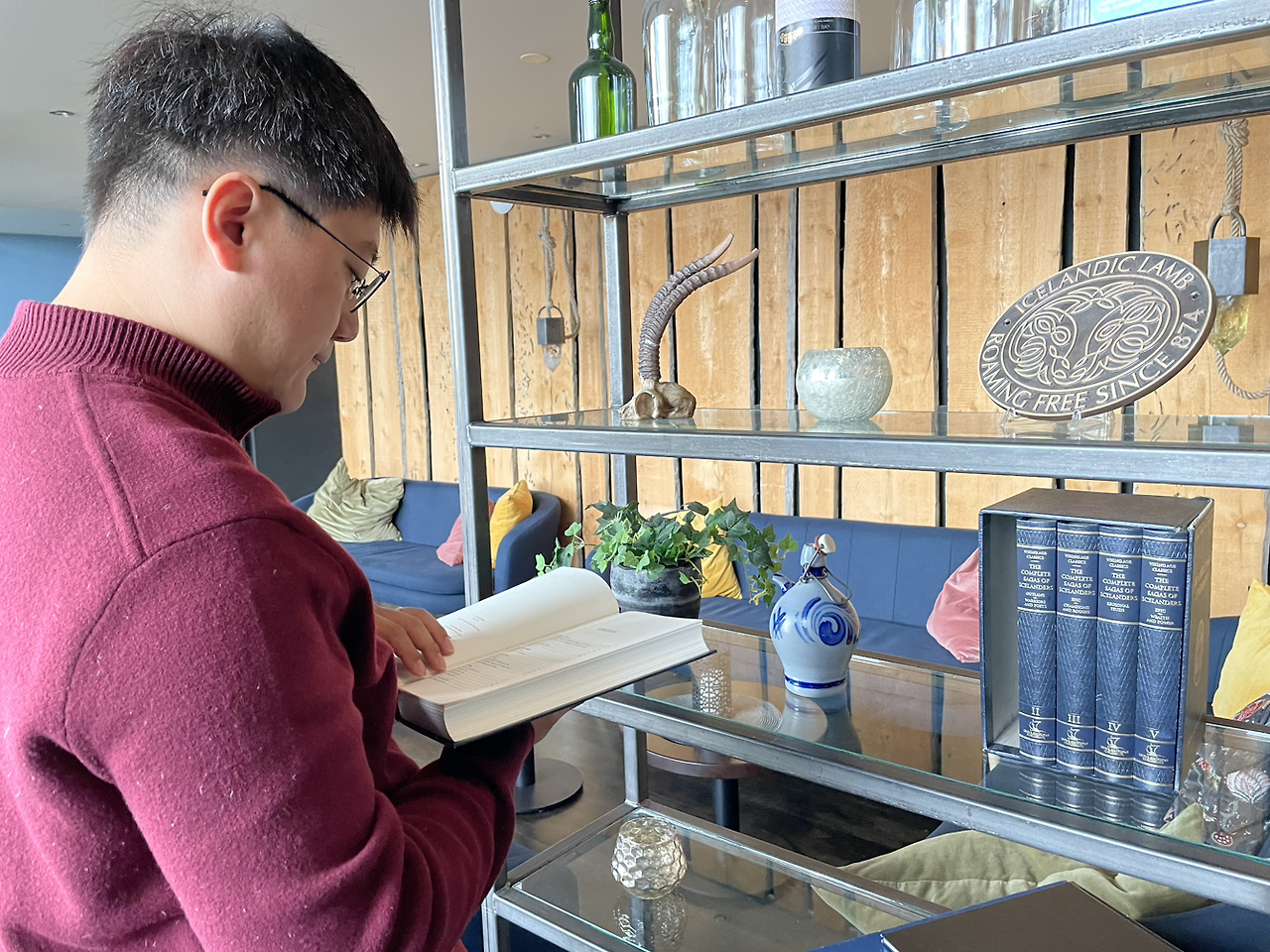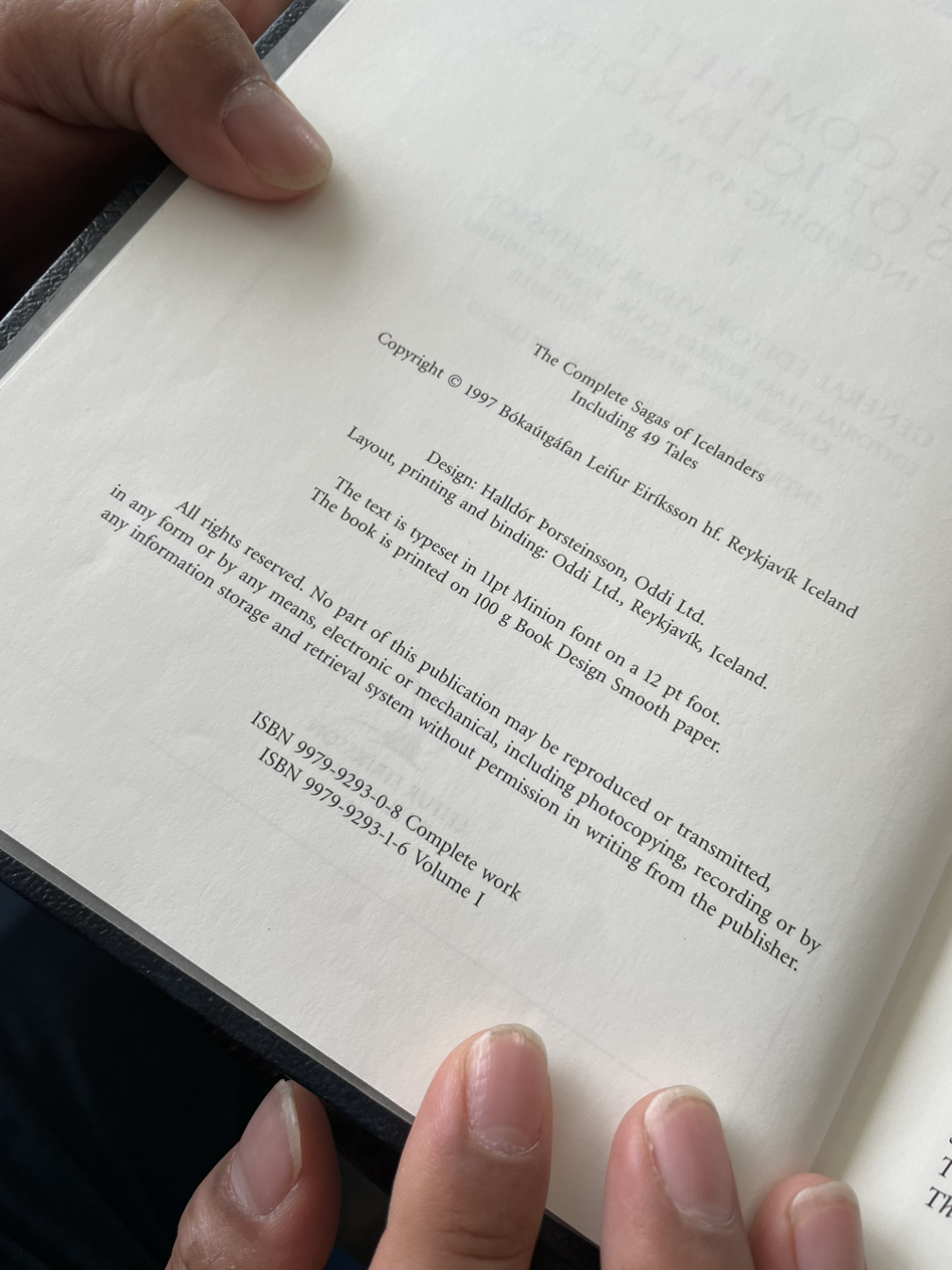 나는 자연 그자체를 보면 그저 좋고 충족되는데 남편은 다르다. 남편은 이야기가 없는 풍경은 지겨워한다. 아이슬란드에 기꺼이 따라와 준 이유도… 잘은 모르지만 아이슬란드 사가가 한몫 했을 거다. 오타쿠답게, 랄까… 첫째날 기념품숍에서 무슨 진짜 얇고 작은 핸드북에 꽂혀서 하나 샀는데(무려 우리돈 3만원), 이날 식당 옆 라운지에 저렇게 본격적인 사가 전집(?) 같은 게 있는 거다.
